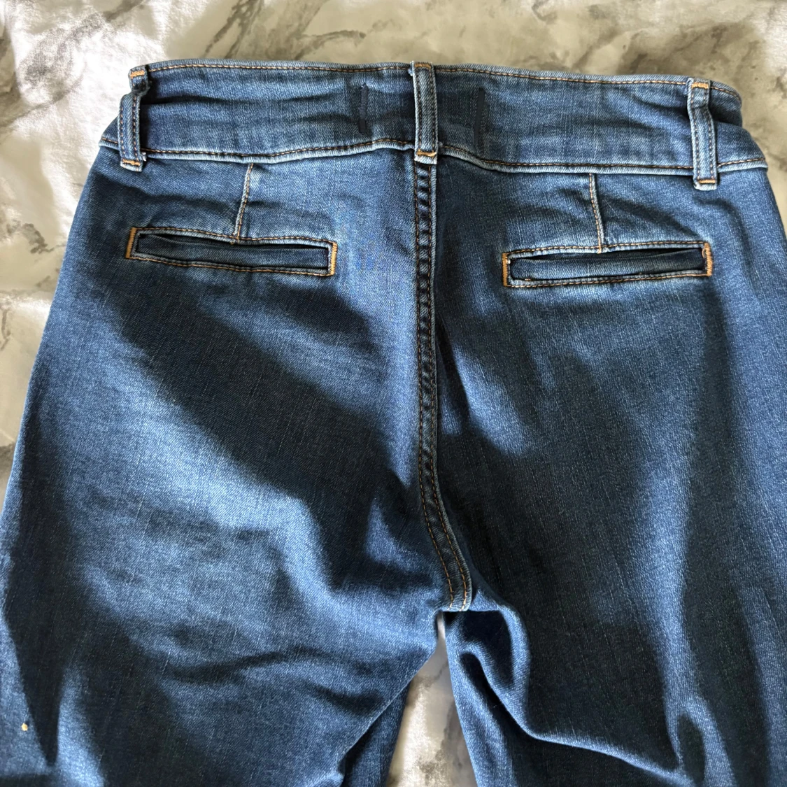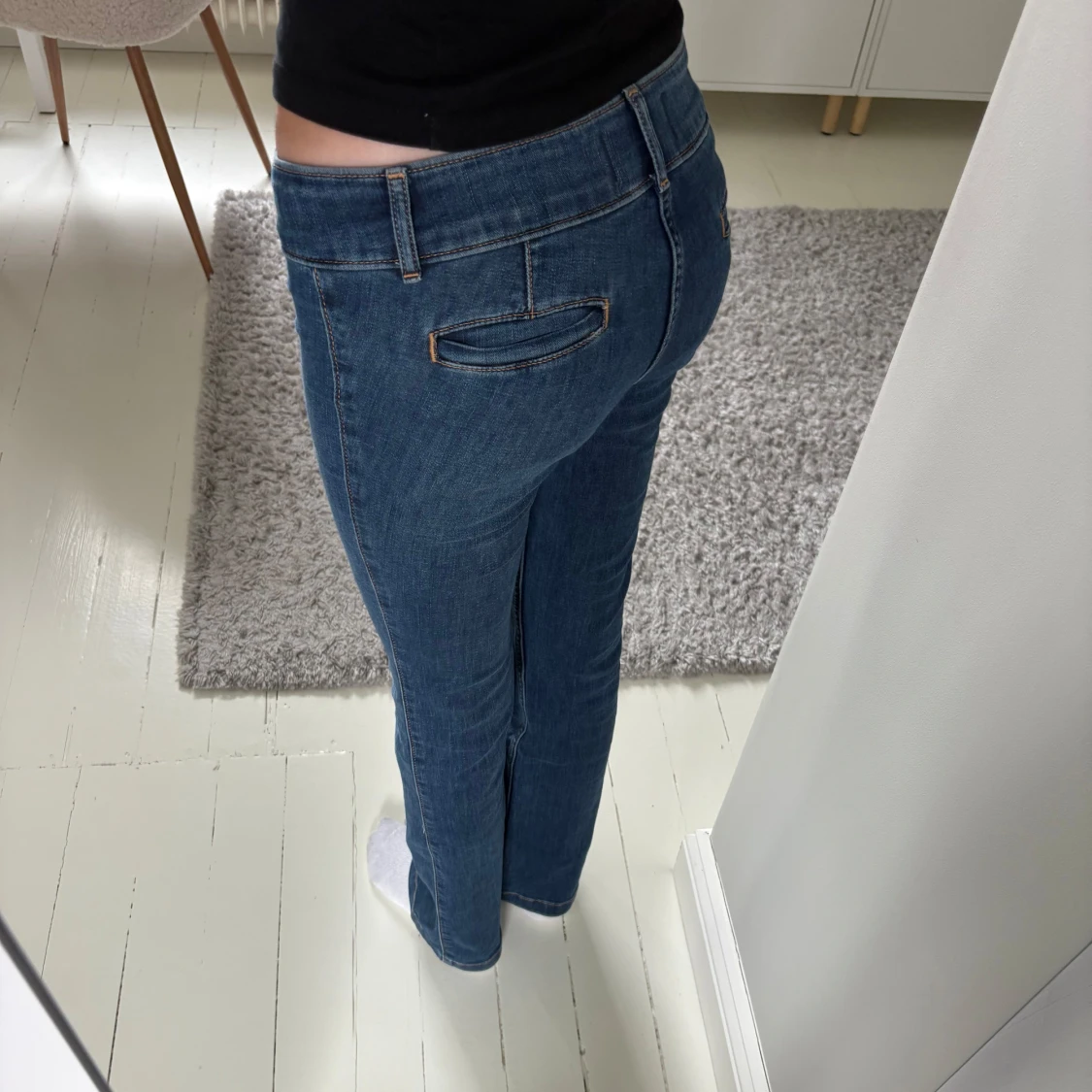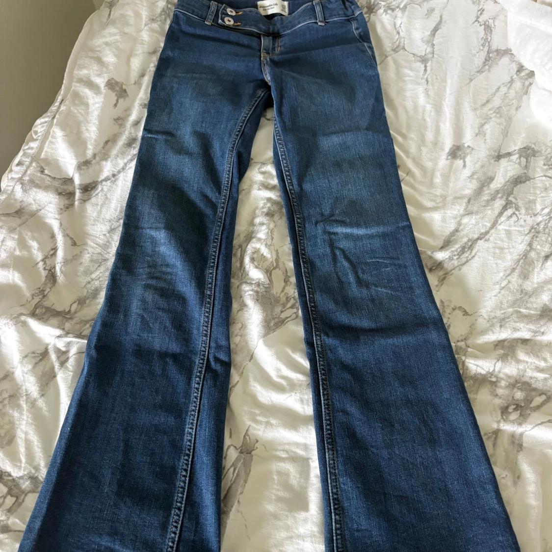 Säljer ett par blå jeans med bootcut-modell och låg midja. Jeansen har två knappar i midjan, klassiska fickor bak. Jeansen är köpta i USA på abercrombie kids, dom är i storlek 11/12 Long men skulle säga att dom motsvarar 32. Jag är 163 cm🥰