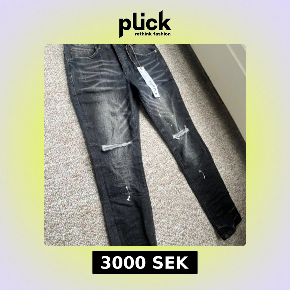 Säljer ett par svarta jeans från Purple Brand med slitningar på benen och lätt tvättad look. Jeansen har skinny passform, klassiska fem fickor och detaljer som dragkedja och knappar. Perfekta för dig som gillar en trendig och avslappnad stil.