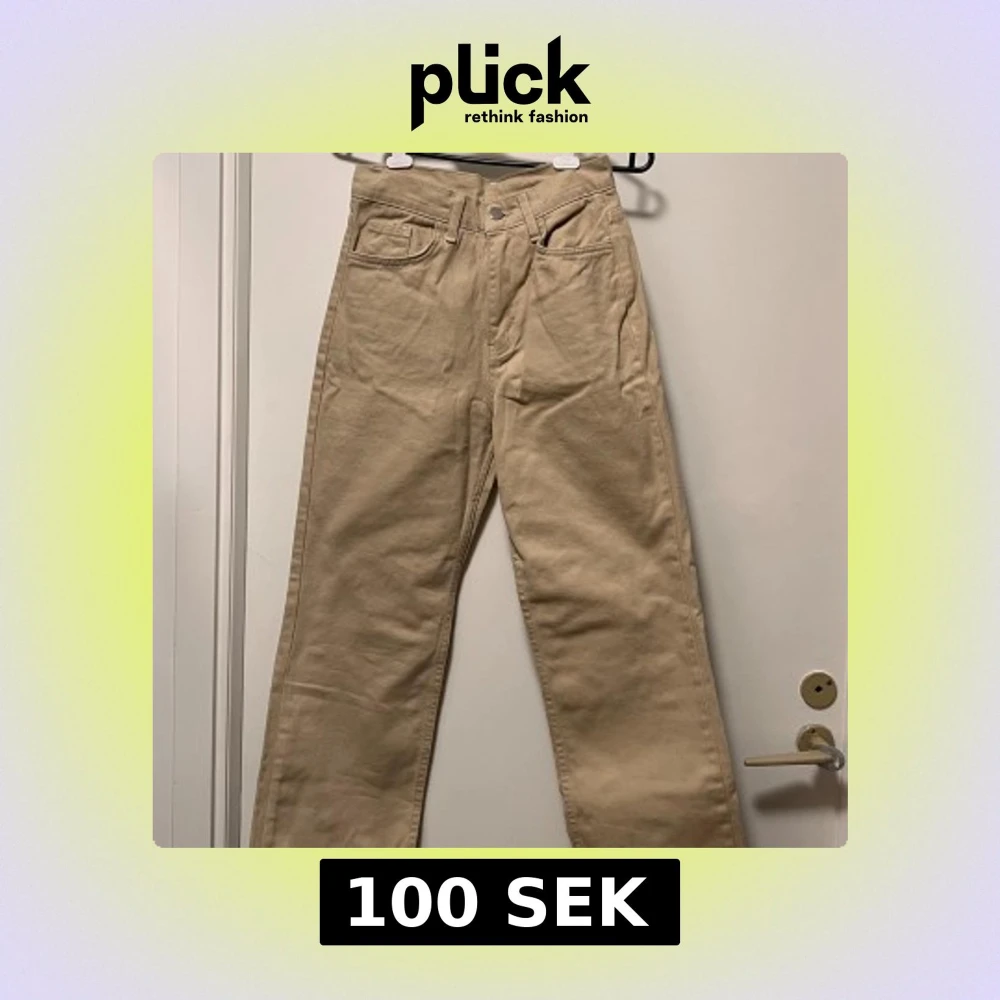 Snygga beige jeans med rak passform och hög midja. Klassisk femficksmodell med knapp och dragkedja framtill. Perfekta för dig som gillar en clean och enkel stil. Materialet är mjukt och känns skönt mot huden.
