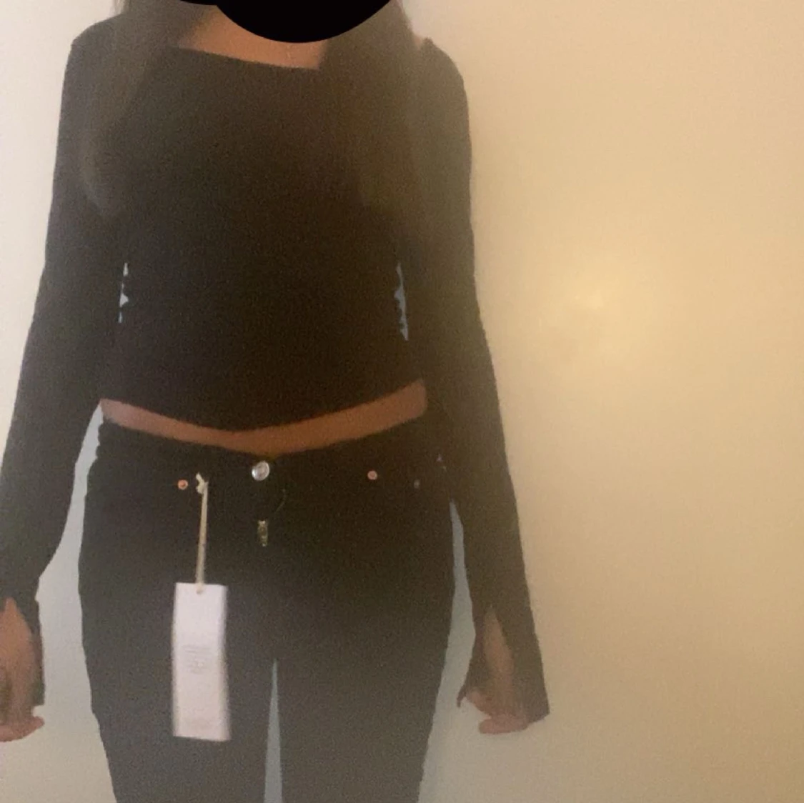 Säljer ett par svarta jeansbyxor med låg midja och klassisk femficksdesign. Byxorna är bootcut och stängs med knapp och dragkedja. Perfekta för en stilren och enkel look.