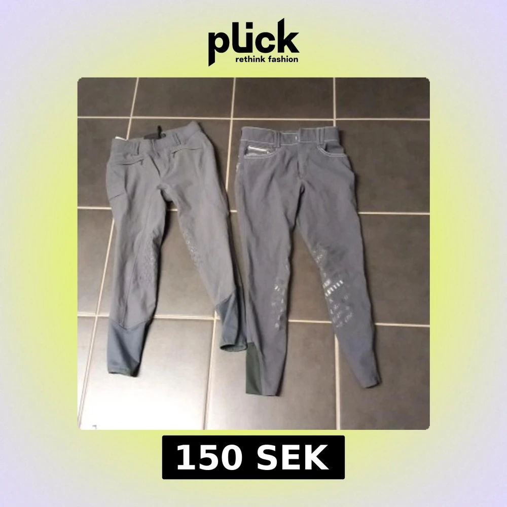 Två par grå ridbyxor med silikongrepp på insidan av benen och bak. Ena paret har snygga broderade detaljer på bakfickorna och dragkedja, medan det andra har en mer stilren look. Båda har hög midja och smal passform, perfekta för ridning. Stl 150 cl och ca 160 cl. Köparen betalar frakten.