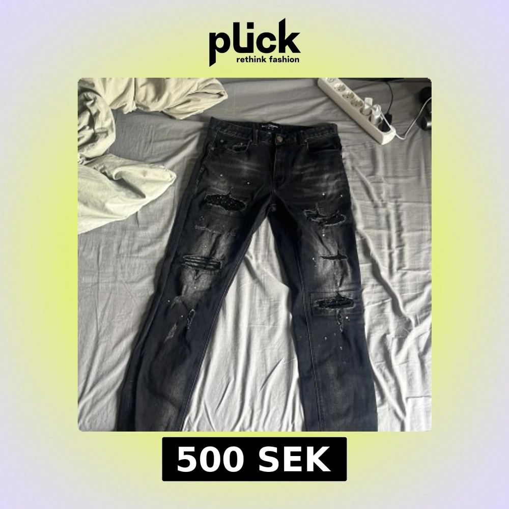 Säljer ett par svarta jeans från Supply & Demand med slitna detaljer och färgstänk. Jeansen har skinny fit, klassisk femficksdesign och coola trasiga partier framtill. Perfekta för dig som gillar en edgy streetstil.