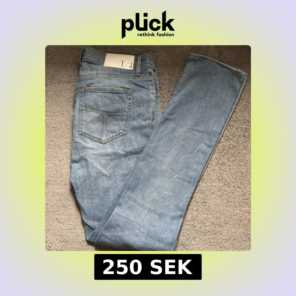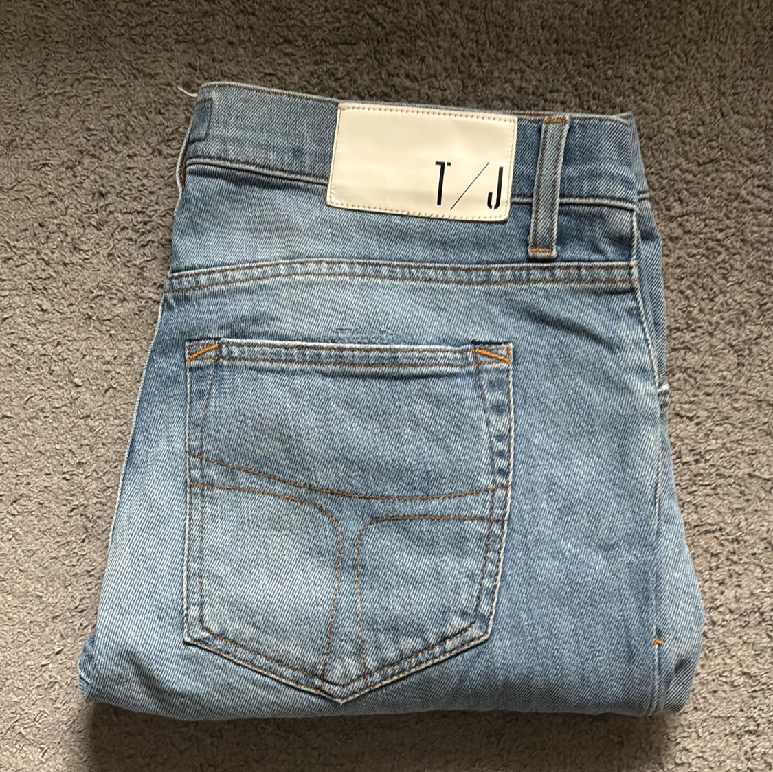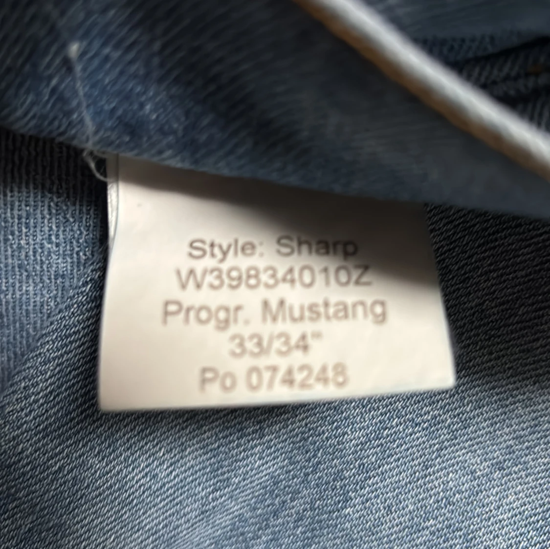 Säljer ett par ljusblå jeans från Mustang i modellen Sharp. Klassisk femficksdesign med kontrastsömmar och vit patch med T/J på linningen. Jeansen har rak passform och är tillverkade i slitstarkt denimtyg.