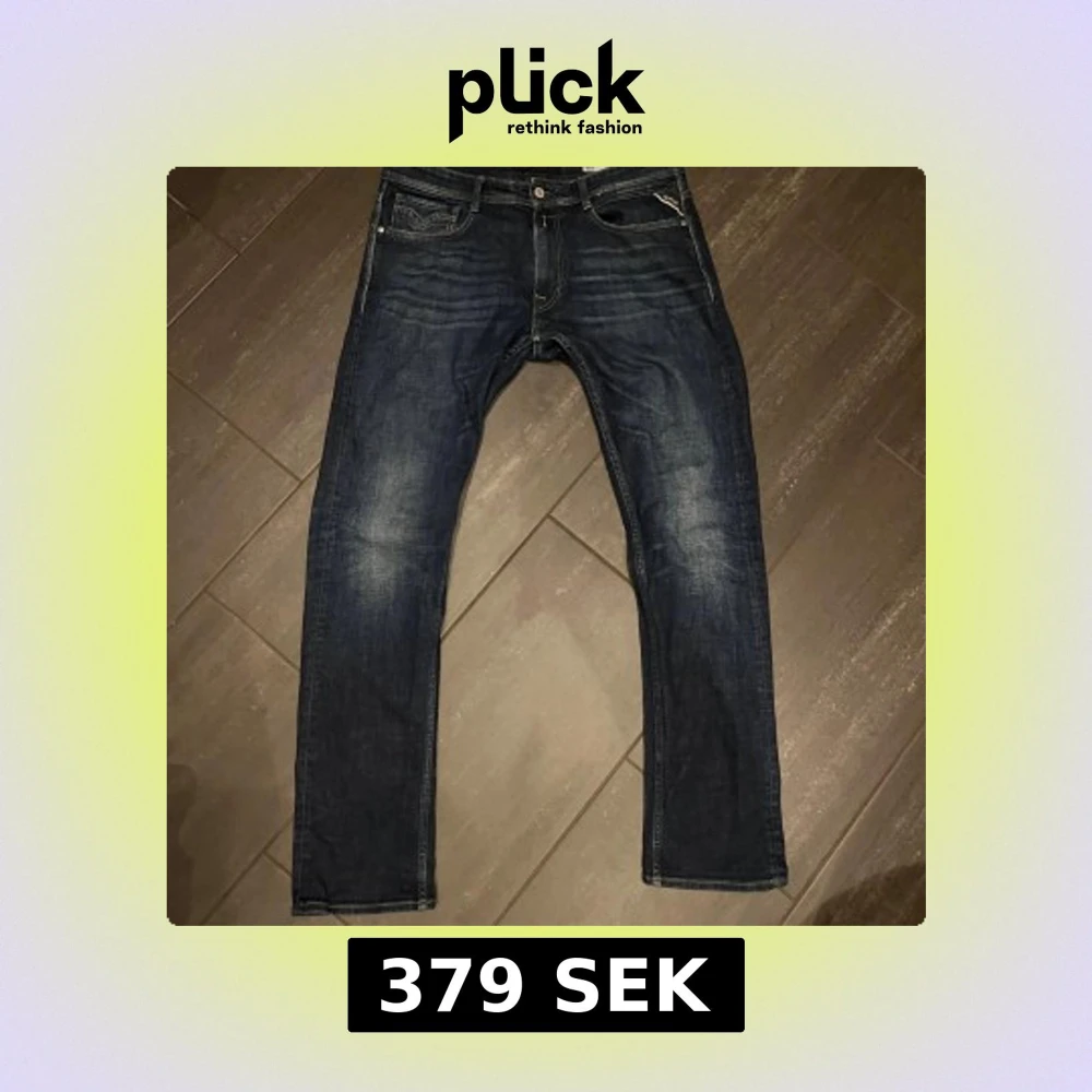 Mörkblå jeans från Replay i modellen Comfort Fit, storlek 33. Normal/raka ben passform med snygga slitningar framtill och bakfickor med dekorativa sömmar.