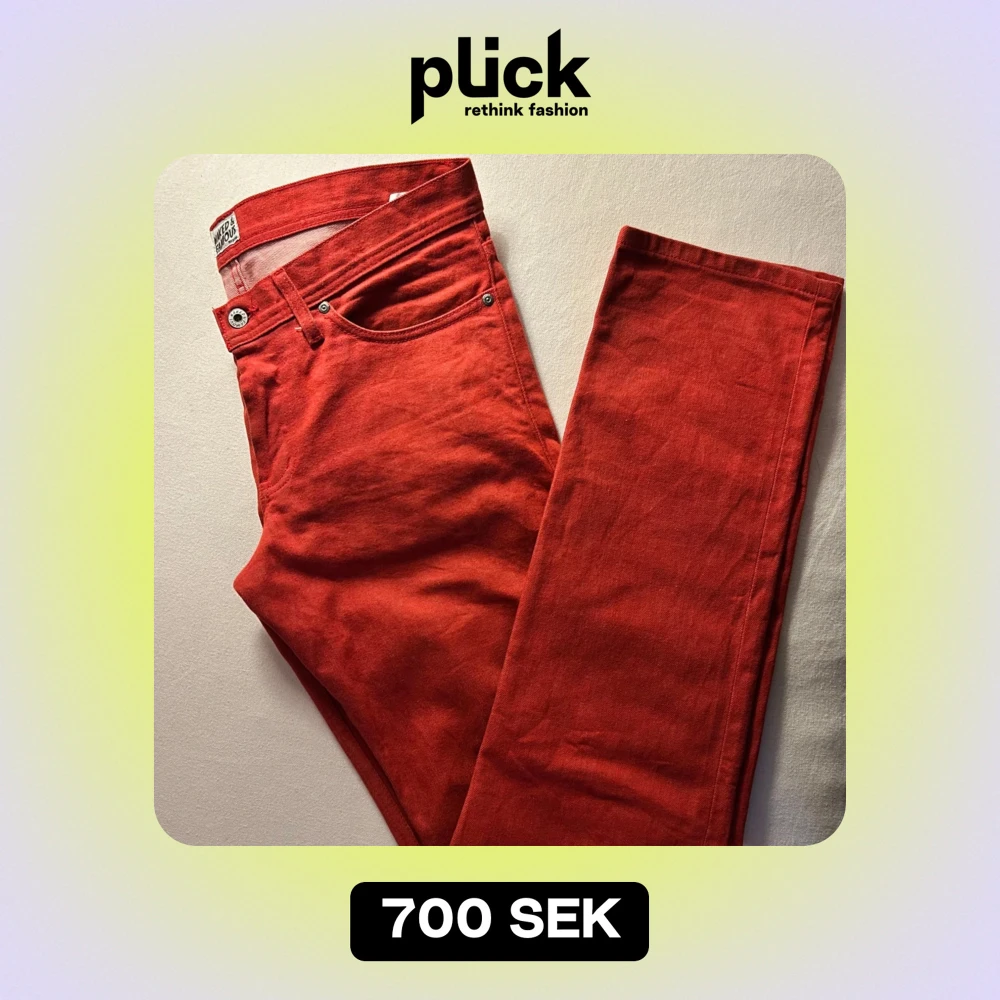 Säljer ett par coola röda jeans från Naked & Famous i modellen WeirdGuy. De är gjorda av 97% bomull och 3% spandex, vilket ger en skön stretch. Jeansen har en snygg selvedge-detalj och är i mycket bra skick. Perfekta för att sticka ut i mängden!