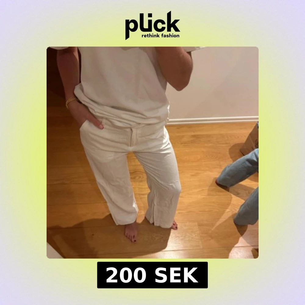 Snygga vita linnebyxor från NLY Trend i storlek 34. Byxorna har raka, lite vidare ben och stängs med dragkedja fram. Passar mig som vanligtvis har 36-48