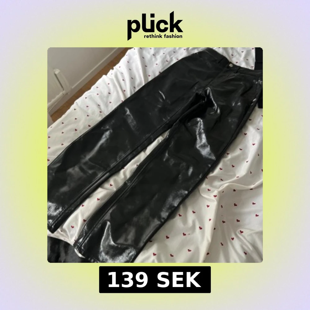 Säljer ett par svarta glansiga byxor i skinnimitation. De har rak passform och klassisk midja med knapp och dragkedja framtill. Perfekta för dig som vill sticka ut med en edgy look.