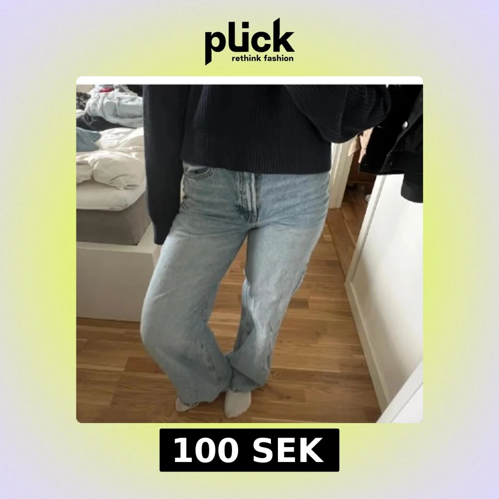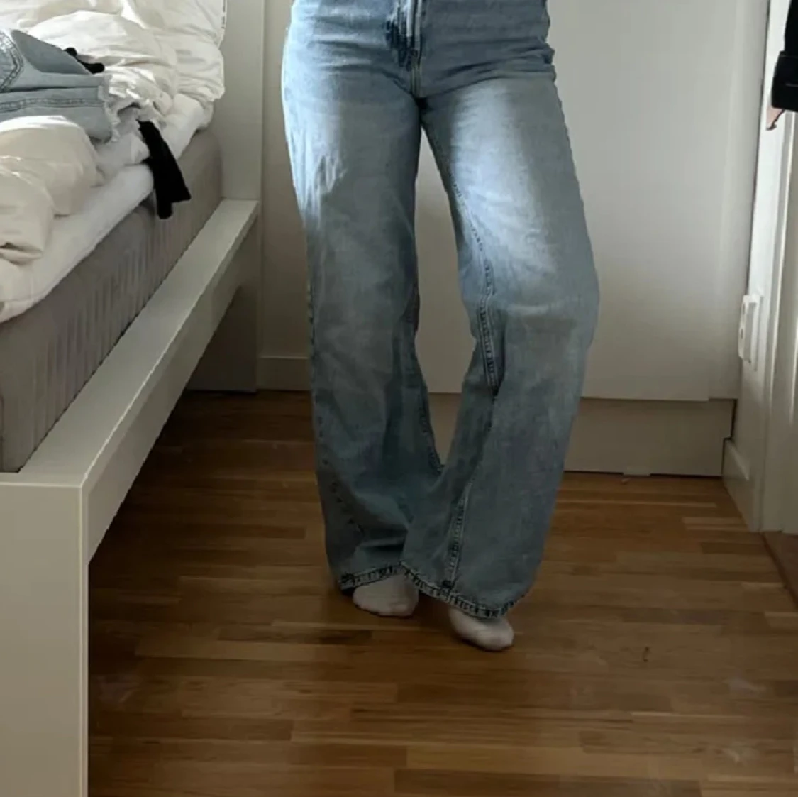 Säljer ett par ljusblå jeans med breda ben. Jeansen har klassisk femficksdesign och stängs med dragkedja och knapp. Perfekta för dig som gillar en avslappnad och trendig look.