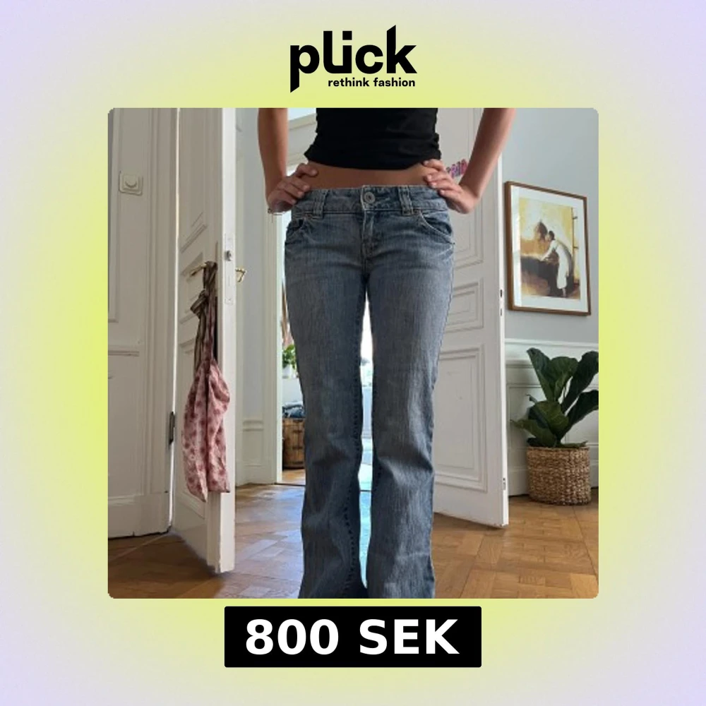 Säljer ett par blå bootcut jeans med låg midja och snygga fickdetaljer bak. Jeansen har klassisk femficksdesign, ljus tvätt och raka ben som blir lite vidare nertill. Perfekta för dig som gillar en avslappnad men ändå trendig look.