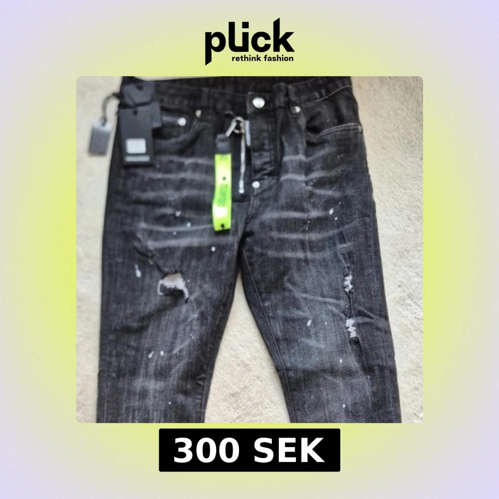 Säljer ett par svarta jeansbyxor från Dsquared2 med coola slitningar och färgstänk. Byxorna har normal passform och klassisk femficksdesign. Perfekta för dig som vill ha en edgy och trendig look.