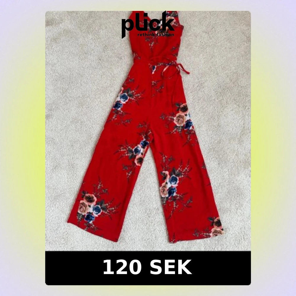 Snygg röd byxdress med blommigt mönster i rosa och blå toner. Byxdressen har v-ringad hals, breda ben och ett knytband i midjan för extra passform. Perfekt för dig som vill sticka ut med färg och mönster.
