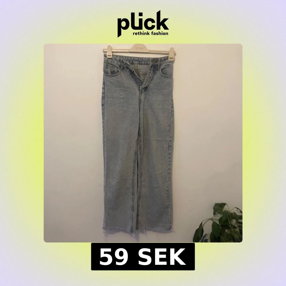Säljer ett par ljusblå jeans med raka ben och råa, fransiga benslut. Klassisk femficksmodell med dragkedja och knapp. Jeansen har en avslappnad passform och är perfekta för en chill vardagslook.
