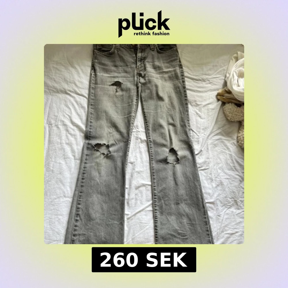 Säljer ett par gråa bootcut jeans och snygga slitningar vid knäna. Jeansen har klassisk femficksdesign, normal midja och är i ett mjukt denimtyg. Perfekta för en avslappnad och trendig look. Det står ingen storlek i men jag är 163 och de passar väldigt bra så skulle säga 34/36. Hålen är gjorda själva