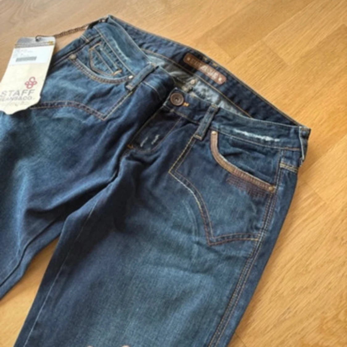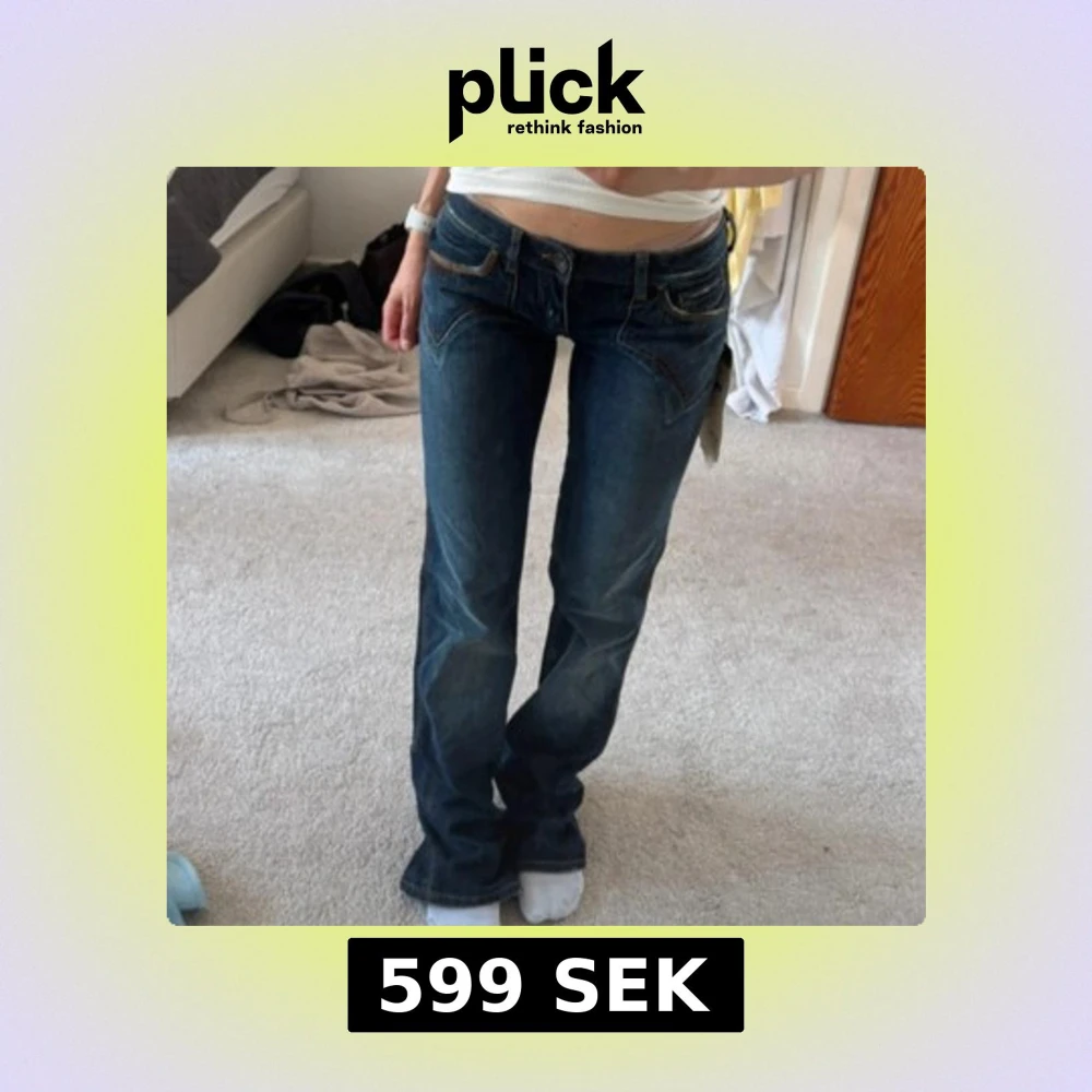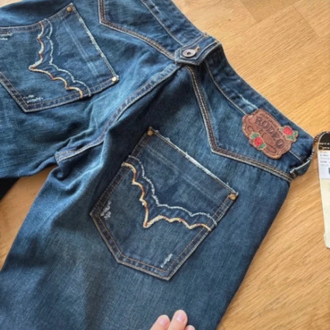 Säljer ett par blå jeans från Rodeo med snygga broderade detaljer på bakfickorna och kontrastsömmar. Modellen är lågmidjad med raka ben och klassisk femficksdesign. Jeansen har en cool western-vibe och är gjorda i bomullsdenim. Midjemått: 39 Innebärslängd: 83