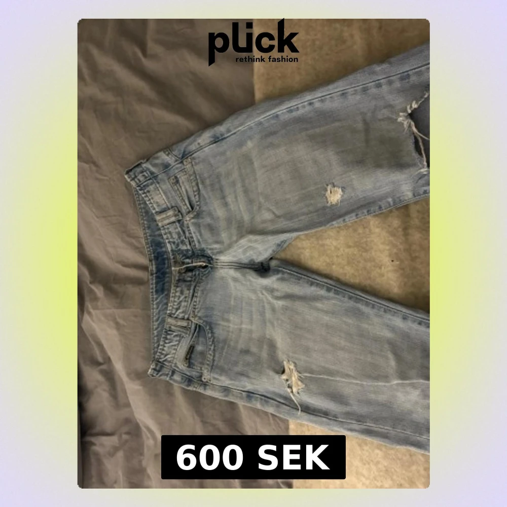 Säljer ett par ljusblå jeans med slitningar och hål på benen för en avslappnad vibe. Jeansen har raka ben och snygga broderade detaljer på bakfickorna. Klassisk femficksmodell i mjukt denimtyg, perfekta till sneakers eller boots.