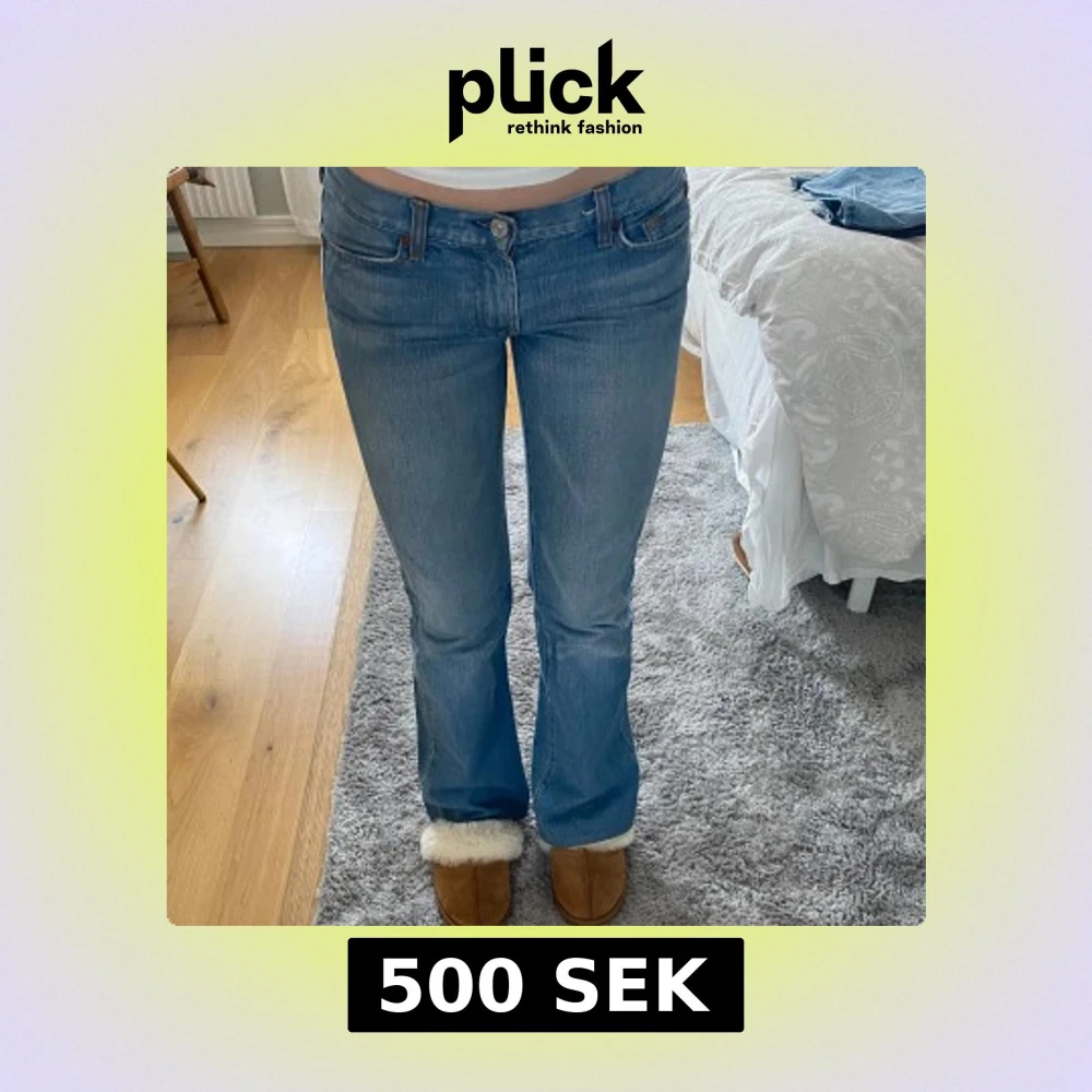 Säljer ett par ljusblå lågmidjade bootcut jeans. Märket är 7 for all mankind och de är i väldigt bra skick.