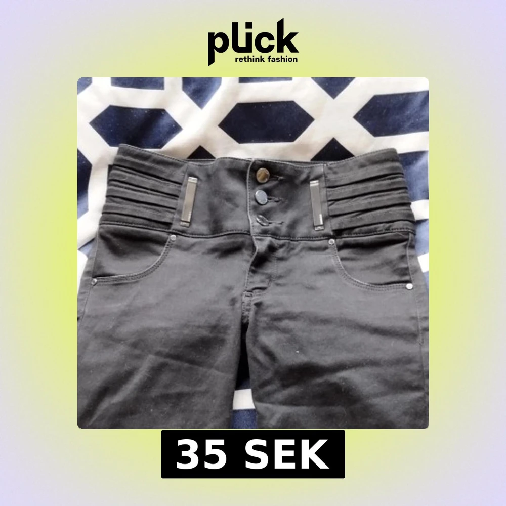 Säljer ett par svarta skinny jeans med coola detaljer. De har en mellan-låg midja med snygga veckade paneler och dekorativa dragkedjor framtill.