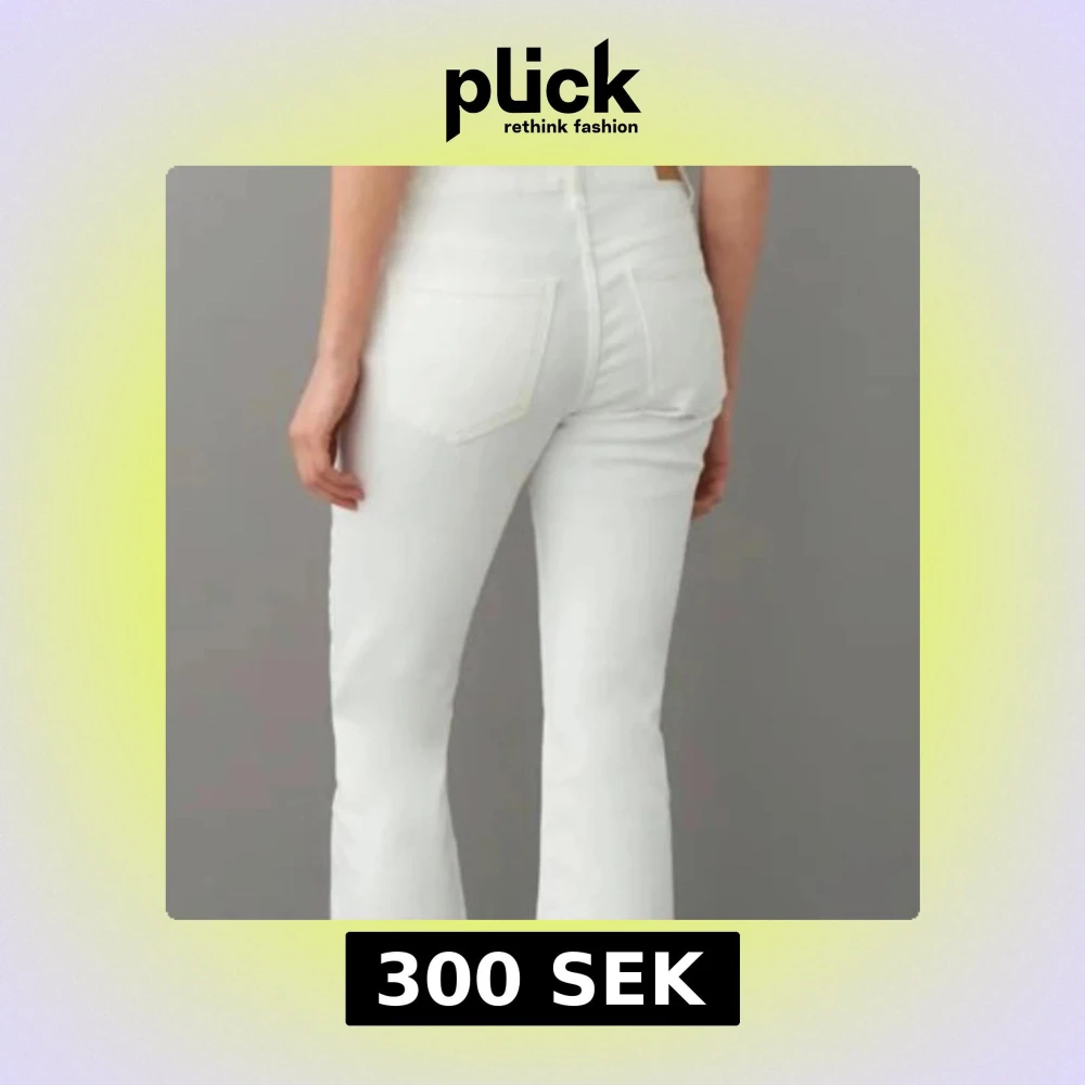 Säljer ett par vita bootcut jeans med klassisk femficksdesign och hög midja. Jeansen har en snygg passform som sitter tajt upptill och släpper ut vid bensluten. Perfekta för dig som vill ha en fräsch och stilren look.