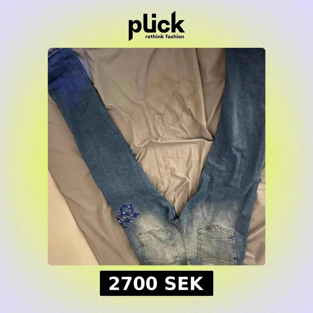 Säljer ett par blå jeans med slitningar och trasiga detaljer på benen. Jeansen har coola blå tryck på låret och stänk av blå färg för en unik look. Klassisk femficksmodell med raka ben och normal passform. Perfekta för dig som gillar streetstyle. Köpta från företag.