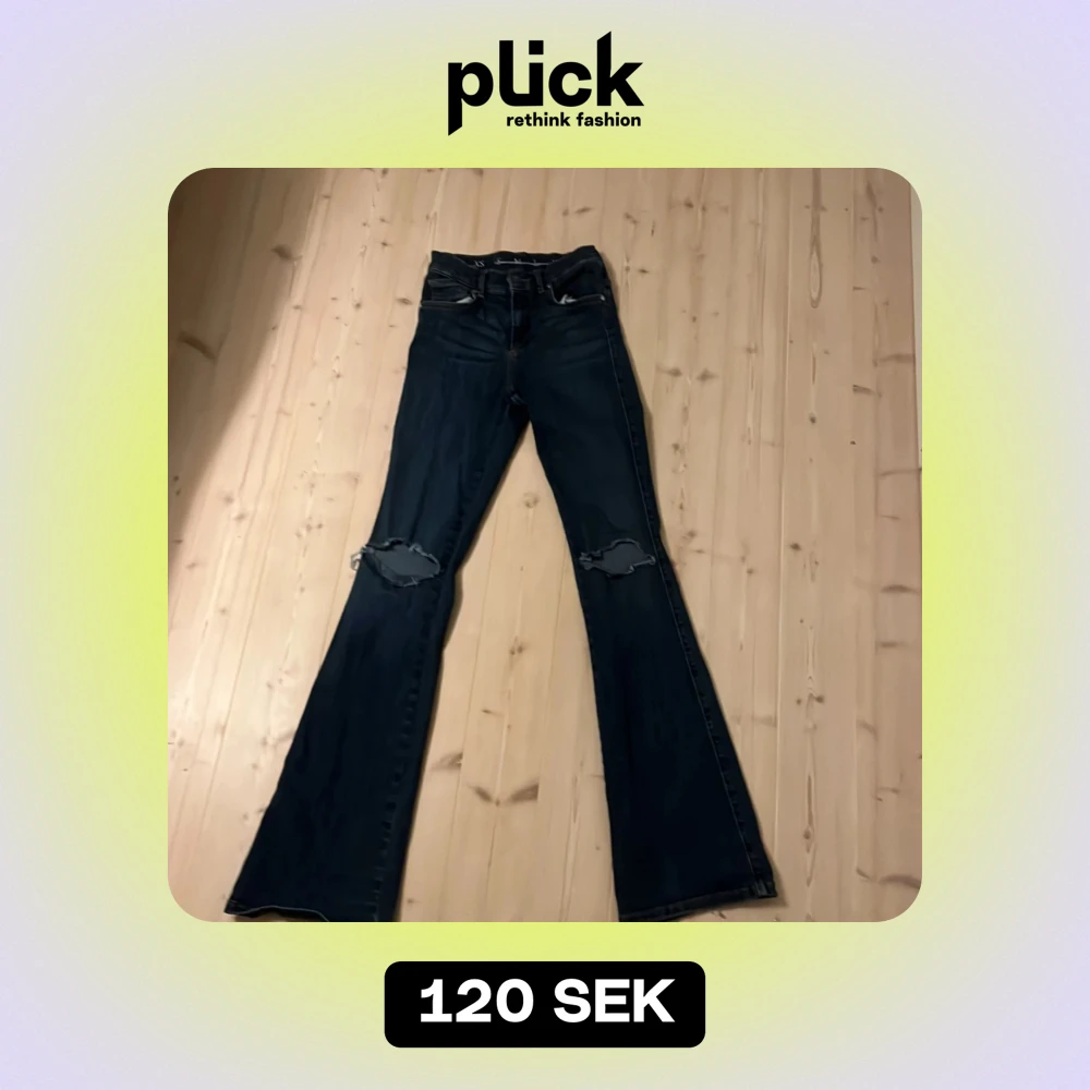 Snygga mörkblåa lågmidjade jeans från Only med hål på knäna, andvända 3 gånger ungefär! Lite slitna längst ner då dom är för låna för mig🥰dåligt ljus men dom är ljusare än vad dom ser ut!!