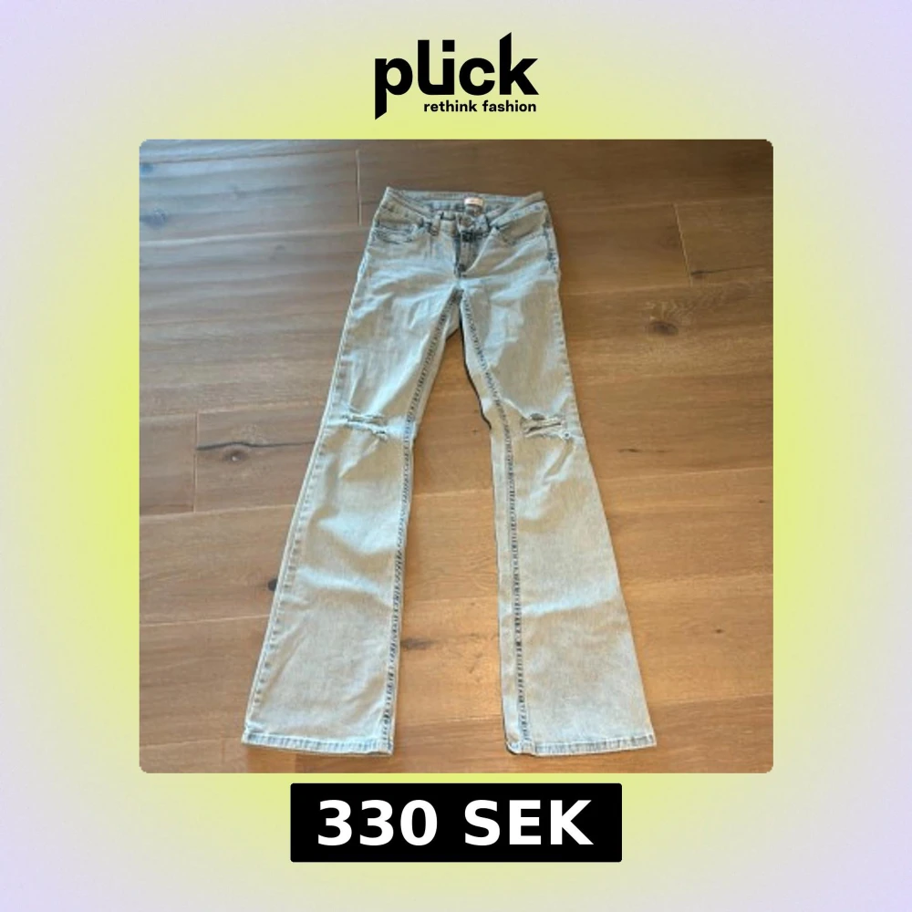 Snygga ljusblå jeans från Nelly med bootcut passform och slitningar vid knäna. Bakfickorna har coolt rosa broderi i zigzag-mönster. Klassisk femficksmodell med knapp och dragkedja. Perfekta för dig som gillar retrovibbar och detaljer.