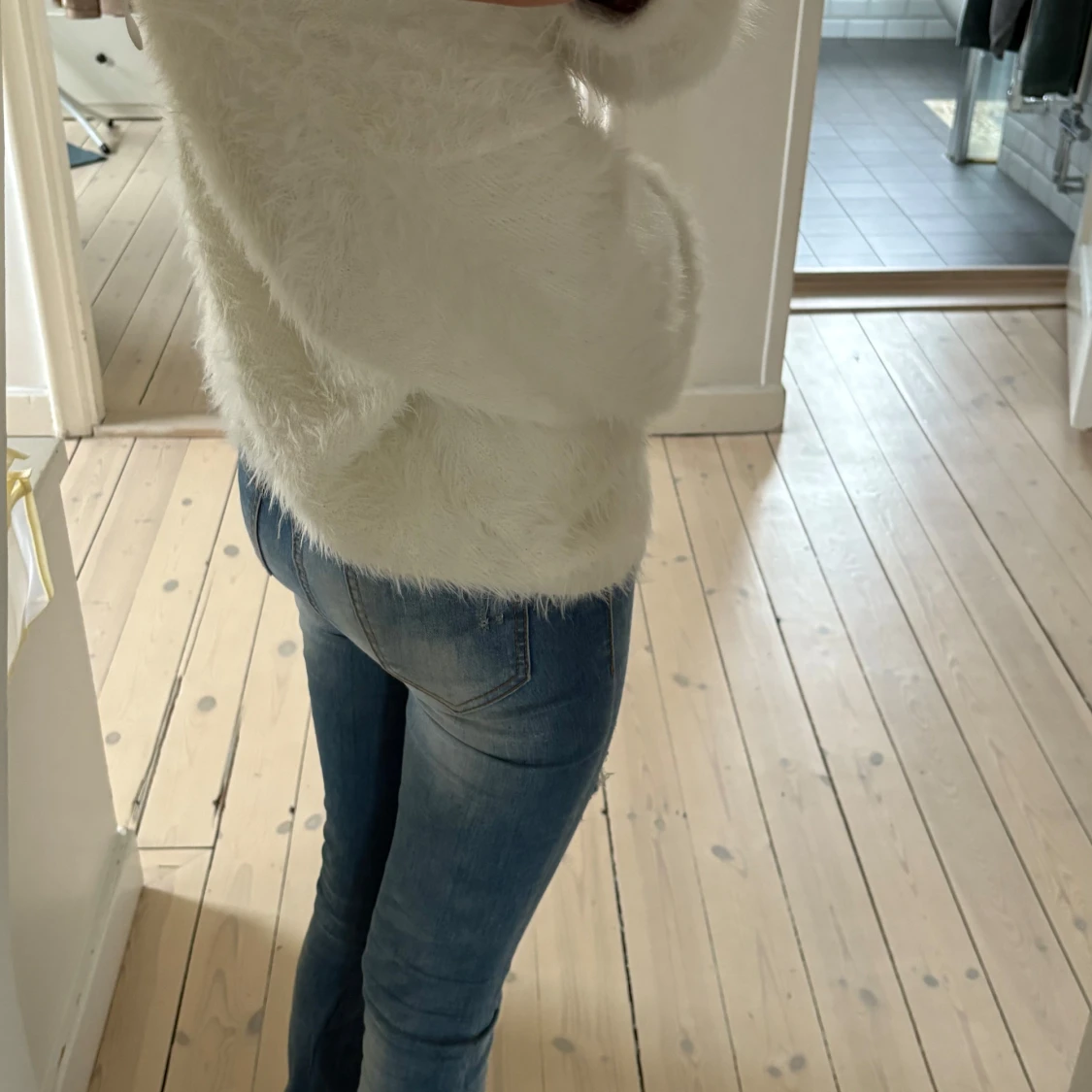 Säljer dessa jättesnygga ljusblåa jeans med sjuukt snygga slitningar🥹💓 de är omsydda till bootcut men syns knappast❣️Jeansen är tillverkade i stretchigt denim för en bekväm passform! Innerbenslängd: ca 70cm. De är mid waist men jag brukar vika ner dem 💘