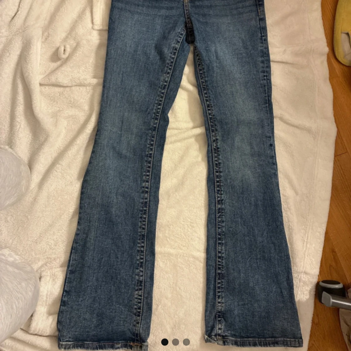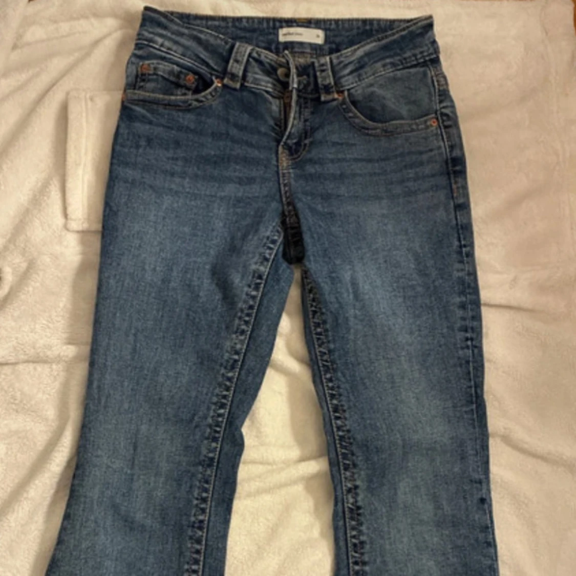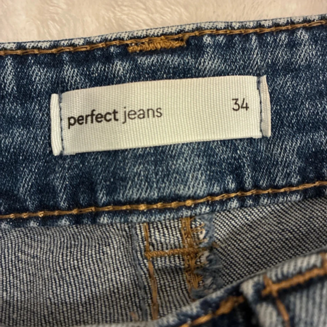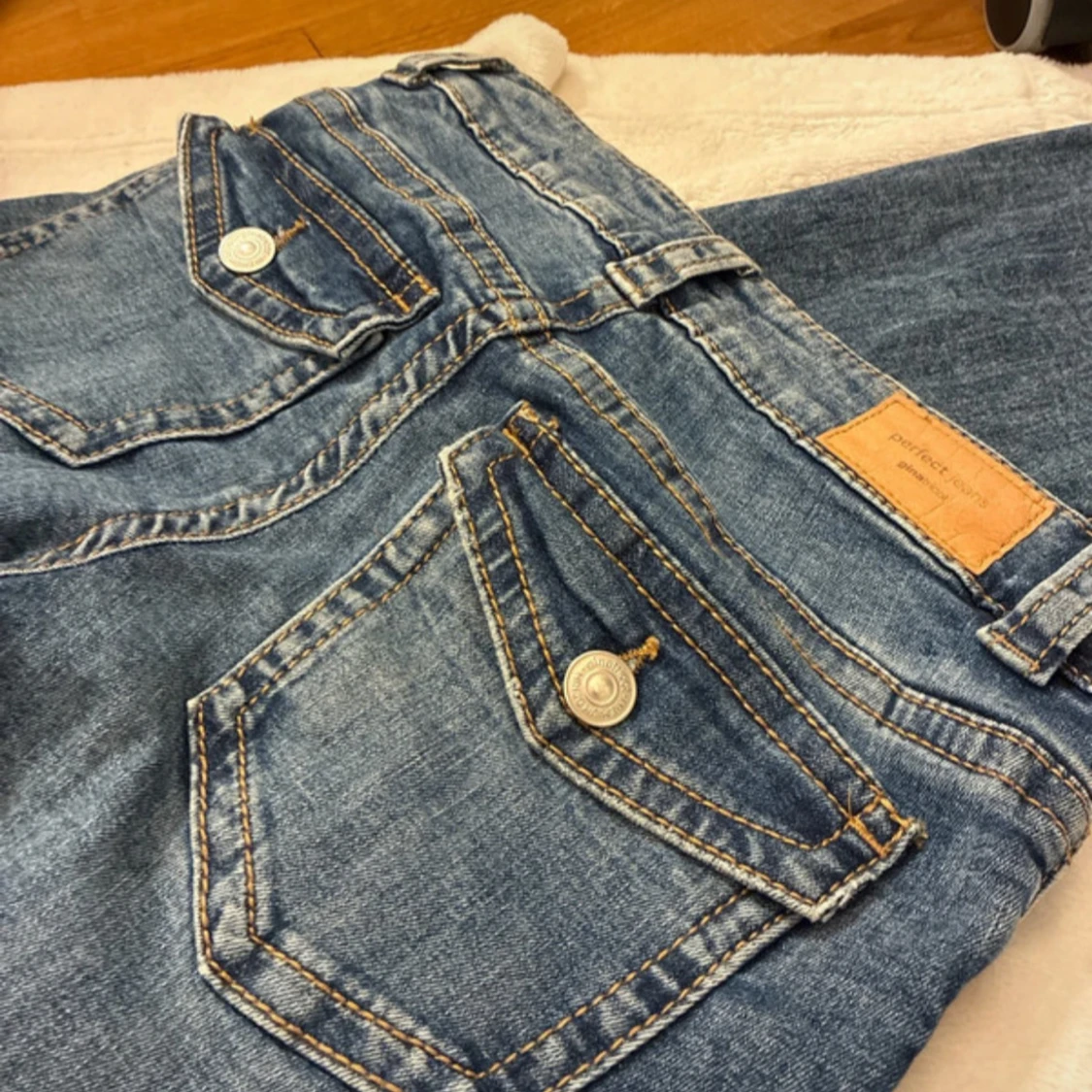 Säljer ett par klassiska blå bootcut jeans från Perfect Jeans. Jeansen har snygga fickdetaljer med lock och knappar bak, samt normal passform och utsvängda ben. Perfekta till sneakers eller boots.