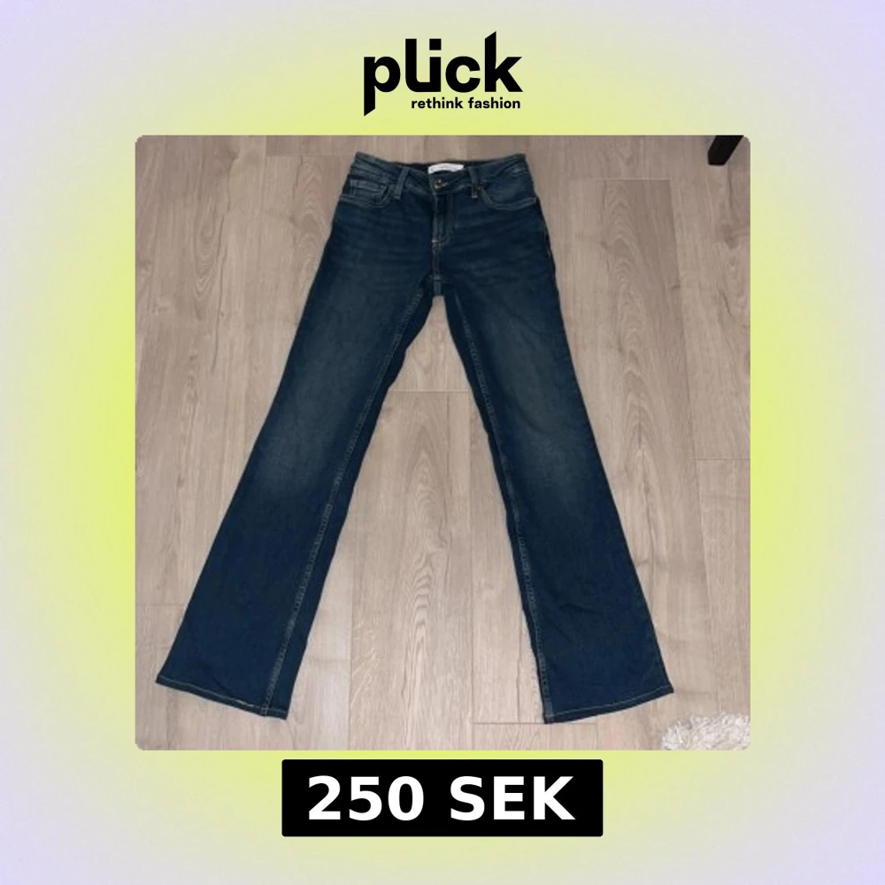 Snygga mörkblå jeans från MNG i storlek 34 med klassisk bootcut passform. Jeansen har fem fickor, gylf med dragkedja och knapp, samt kontrastsömmar. Perfekta för dig som gillar en retro vibe och vill ha ett par jeans med lite utsvängda ben.