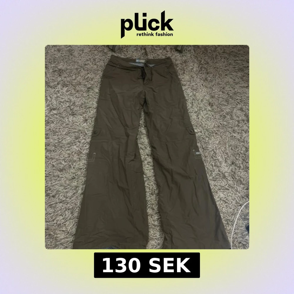 Bruna byxor från Roxy Girl med vida/bootcut ben och cargofickor på sidorna. Byxorna har meshfoder i ljusblått och är i täck-matterial.