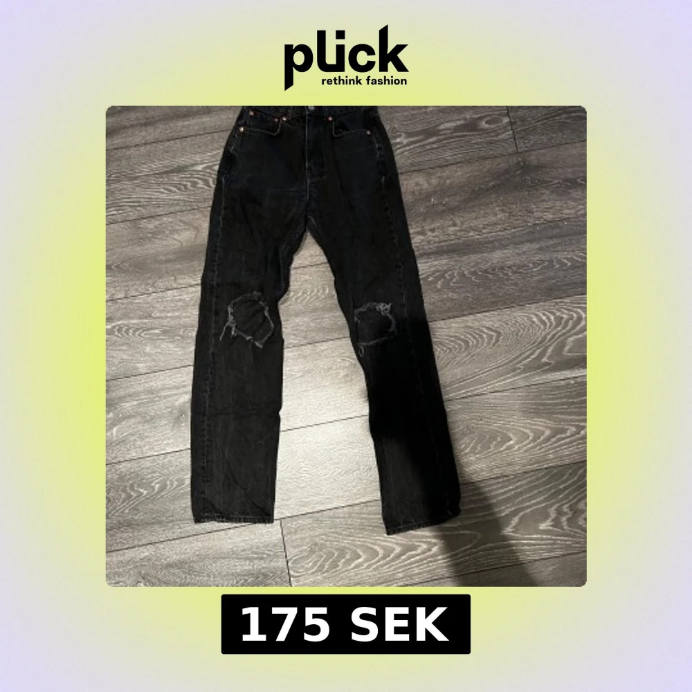 Säljer ett par svarta jeans från Gina tricot med coola slitningar på knäna. De har en klassisk femficksdesign och knappgylf. Perfekta för en avslappnad stil.