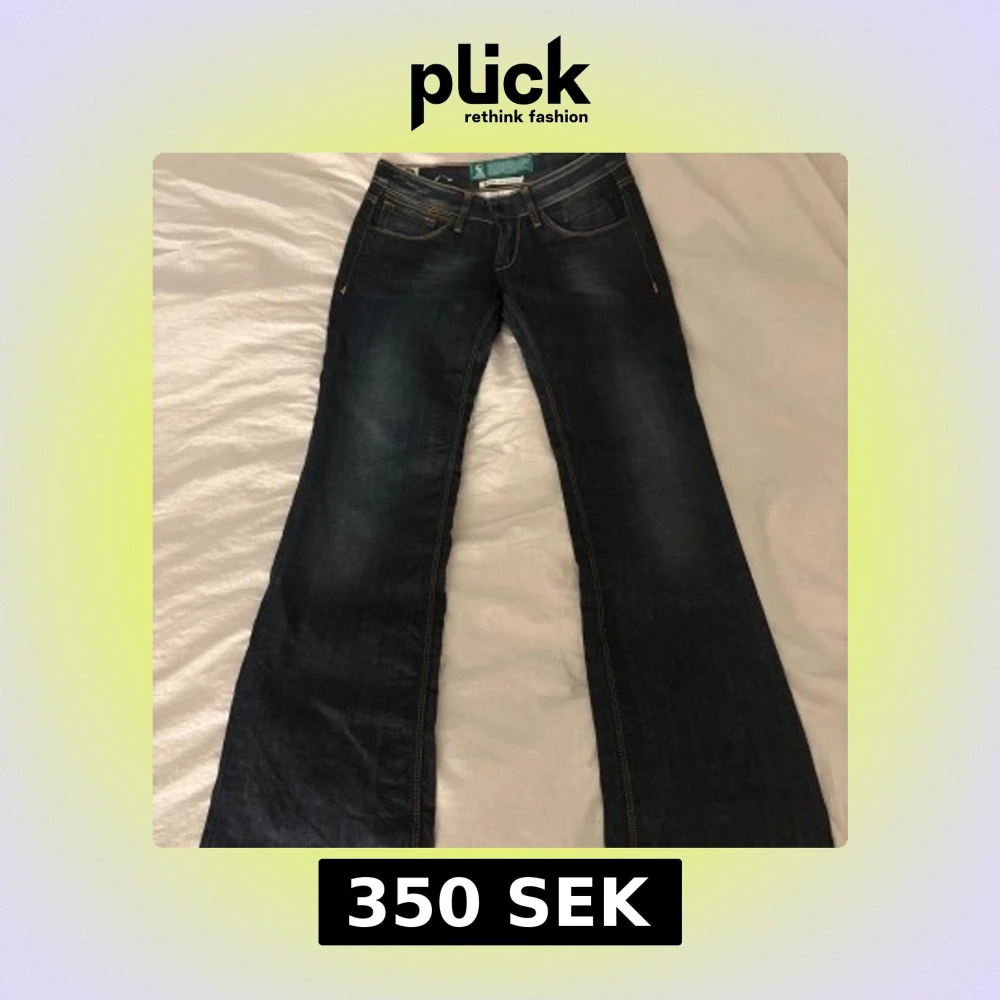 Snygga mörkblå jeans med låg midja. Skulle säga att de är i storlek 32-34. Kan skicka mått vid intresse. Säljer pågrund av att dem är för små.