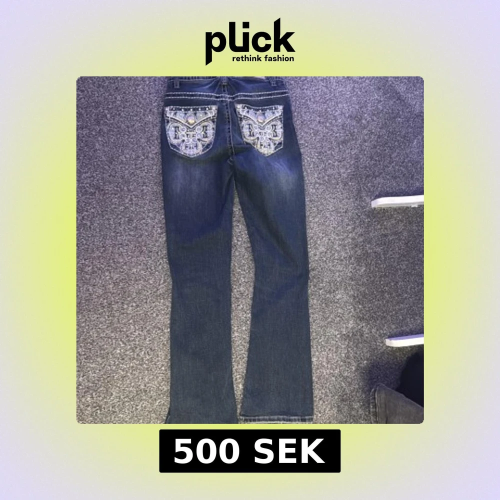 Mörkblå jeans från Sexy Couture med bootcut-modell. Fickorna är dekorerade med broderier, paljetter och gnistrande stenar för en extra blingig look. Snygga kontrastsömmar och detaljer både fram och bak. Perfekta för dig som gillar att sticka ut. Storlek 34/36. Jag säljer dom för jag vill köpa ett par andra jeans och dom hära är väldigt fina men inte vad jag vill ha