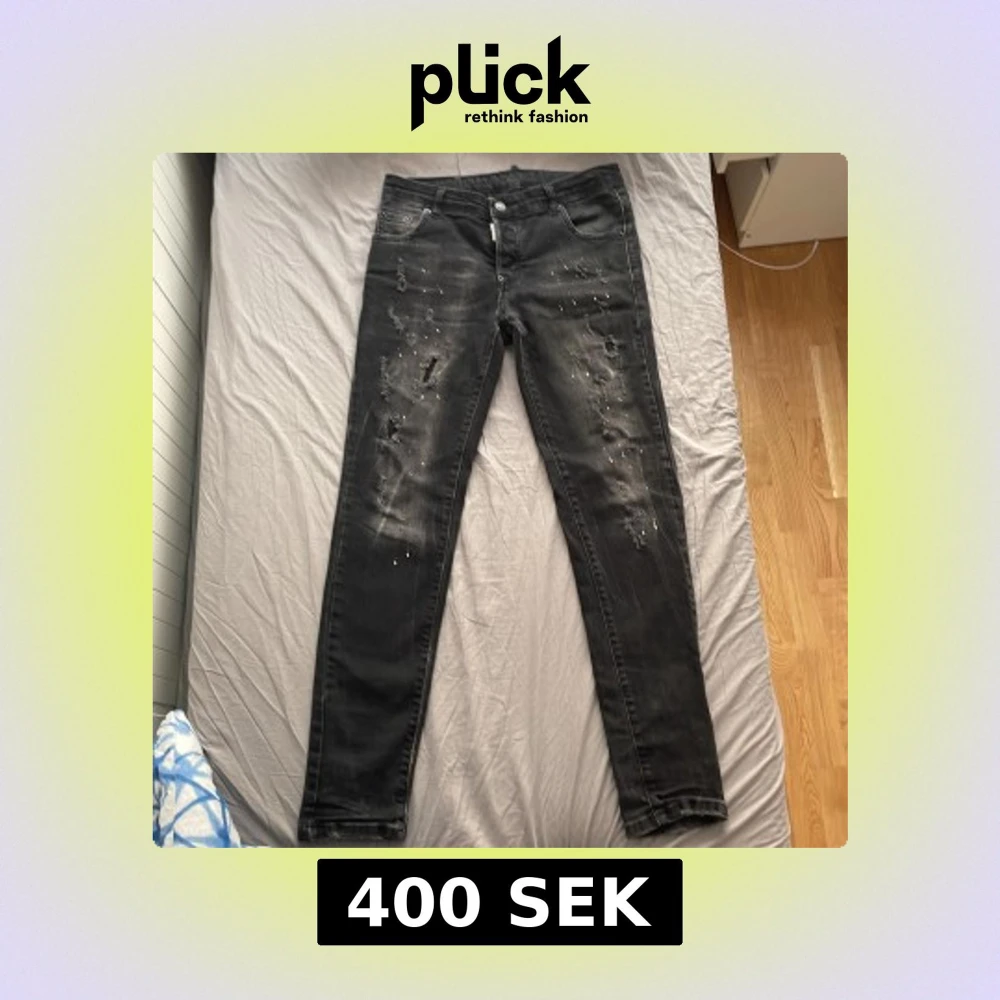 Säljer ett par svarta jeans från Dsquared2 med slitna detaljer och färgstänk framtill. Jeansen har klassisk femficksdesign, knappgylf och smal passform. Perfekta för dig som vill ha en edgy och trendig look. Vet inte om den är äkta. Den är 97 cm lång.