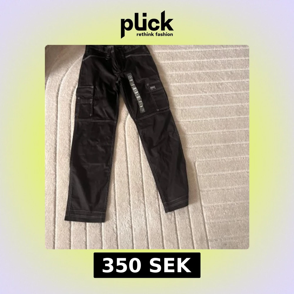 Svarta cargopants från Bluewear med kontrasterande vita sömmar och flera praktiska fickor på sidorna. Byxorna har rak passform och är tillverkade i slitstarkt material, perfekta för en cool och funktionell look.