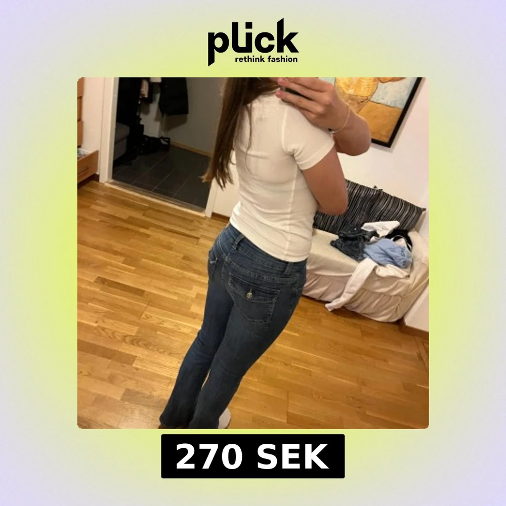 Säljer jättesnygga bootcut jeans som jag inte använt ofta alls, för de är för små för mig.💕 Midjemåtten: 34cm Innerbenslängd: 75cm A: 20cm B: 15cm C: 22cm. Lite strechiga.