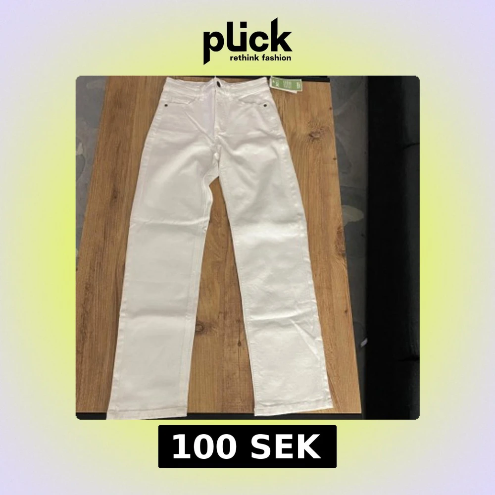 Snygga vita jeansbyxor med hög midja och raka ben. Perfekta för en stilren look. Byxorna har klassisk femficksdesign och knappgylf. Har aldrig använt, den är helt ny och där kan ni se lappen.