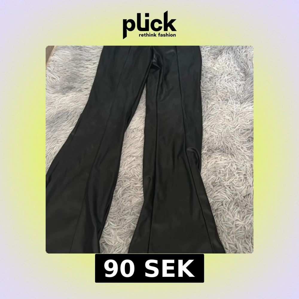 Snygga svarta bootcut byxor från H&M Divided i skinnimitation. Byxorna har hög midja och en glansig finish som ger en cool vibe. Perfekta för dig som vill sticka ut med en trendig look.