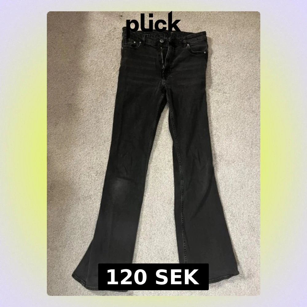 Säljer ett par svarta bootcut jeans från &Denim i storlek 34. De har hög midja och klassisk femficksdesign. Jeansen är i stretchig denim och har en snygg, mörk tvätt som passar till allt. Perfekta om du gillar en retroinspirerad siluett med utsvängda ben.