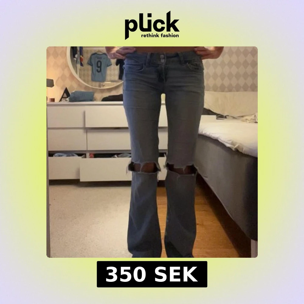 Säljer ett par ljusblå bootcut jeans med slitna detaljer vid knäna, fransiga benslut. Jeansen har klassisk femficksdesign och normal passform upptill. Perfekta för dig som gillar en avslappnad och trendig look.