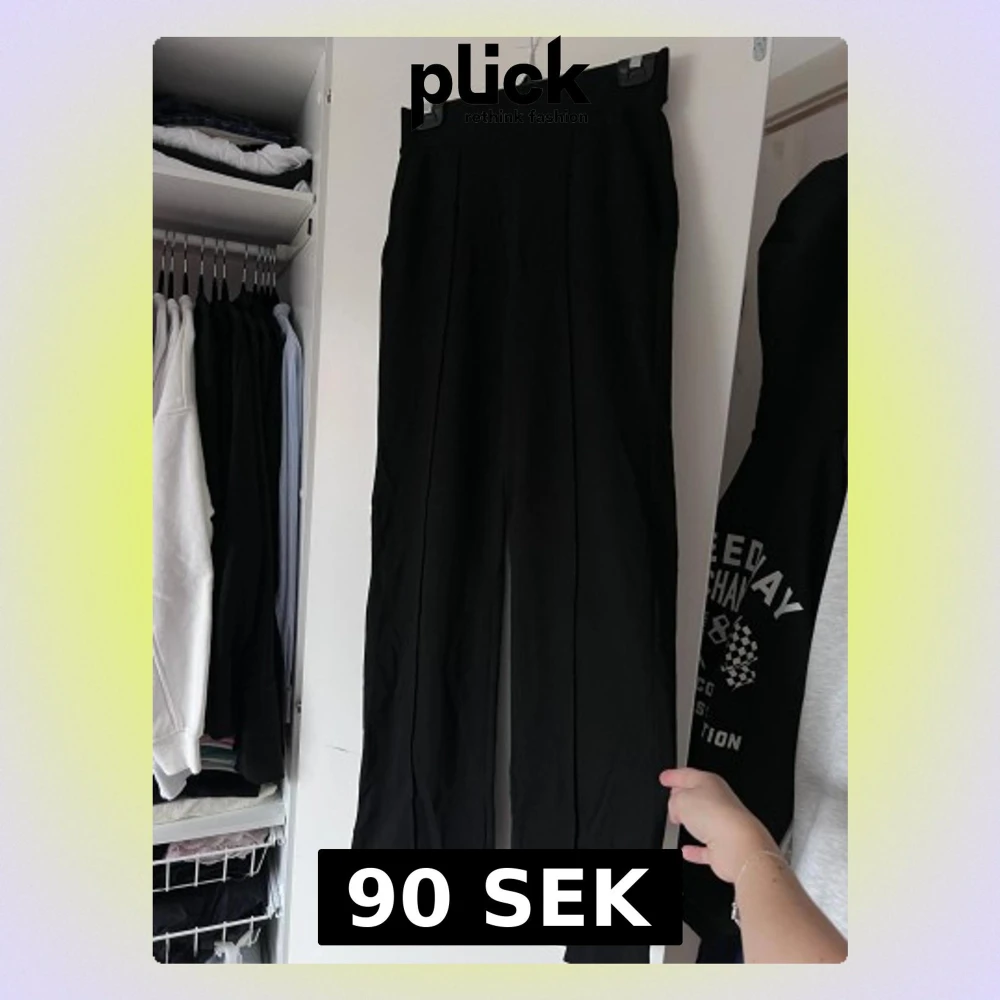 Snygga svarta kostymbyxor med hög midja och raka ben. Byxorna har en stilren design med diskreta fickor baktill. Använda en gång! Önskar du veta exakta mått? Tveka inte att höra av dig!
