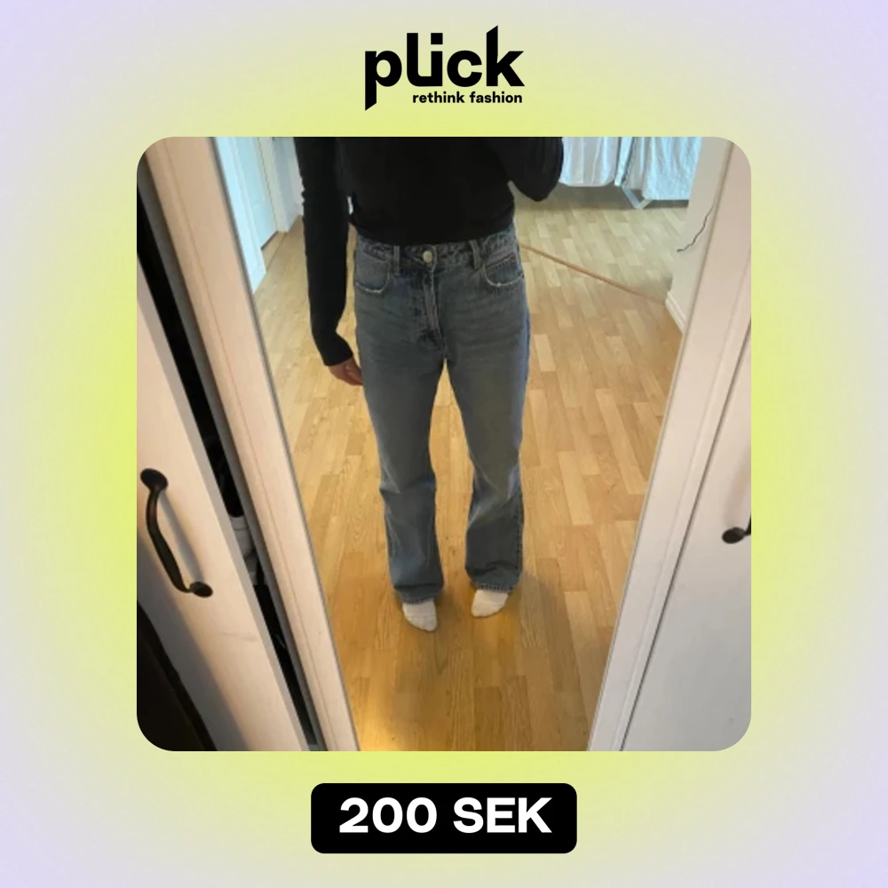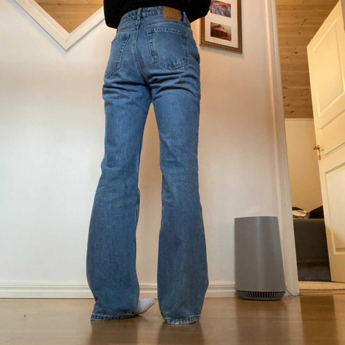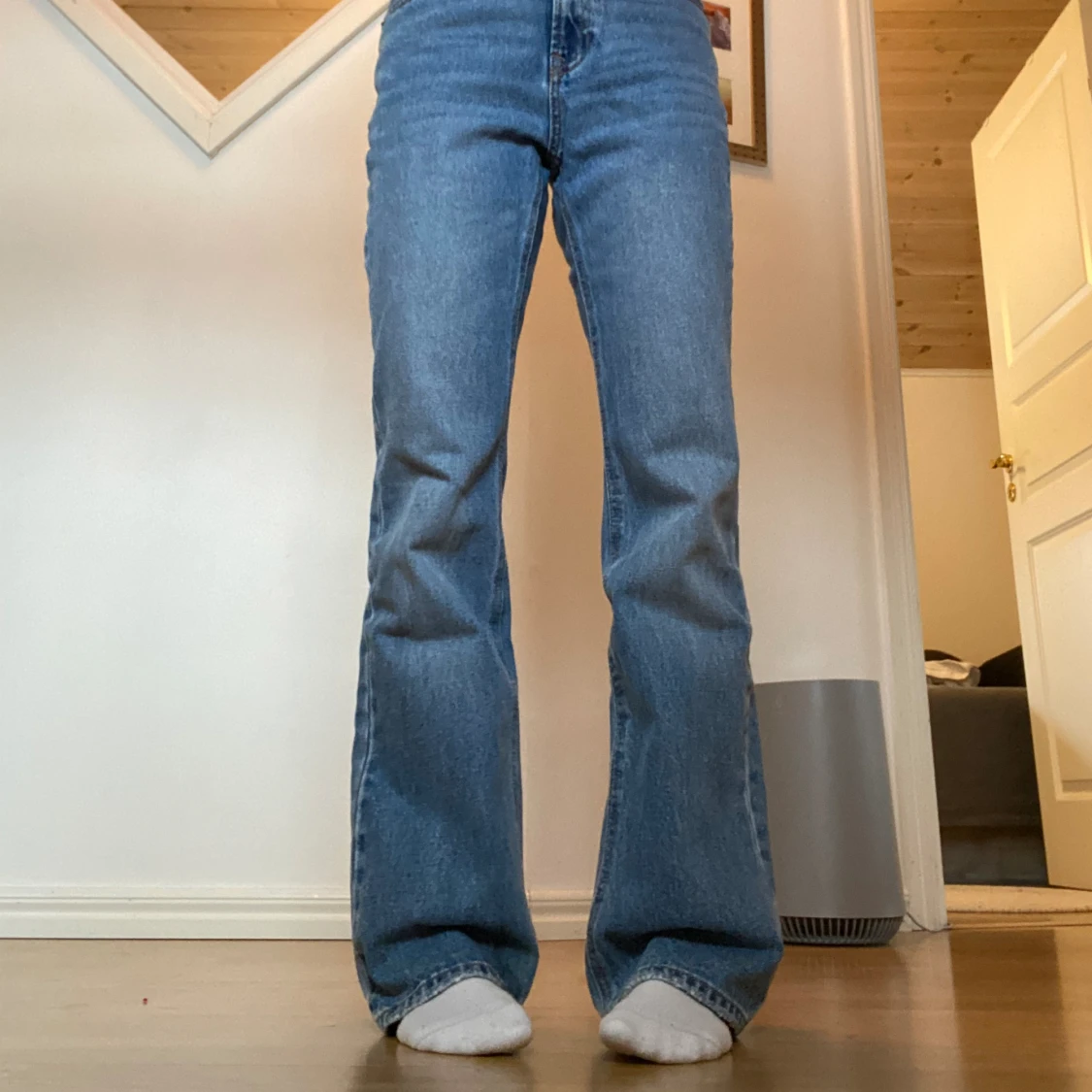 Blåa jeans från stradivarius med lite bootcut. De är i fint skick och bara använda några gånger av mig!