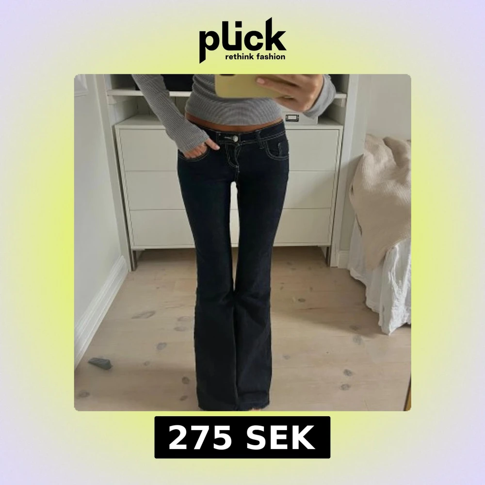 Snygga mörkblå jeans med bootcut-modell och markerade vita kontrastsömmar. Byxorna har låg midja, klassiska fem fickor och är tillverkade i stretchigt denim för en bekväm passform. Har sprättat upp de längst ner för att passa mig som är 173.