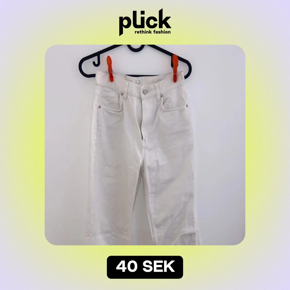 Säljer ett par vita jeansbyxor i bra skick. De har en klassisk femficksdesign och är perfekta för både vardag och fest. Byxorna har en rak passform och är tillverkade i ett slitstarkt material. Perfekta för vår och sommar!