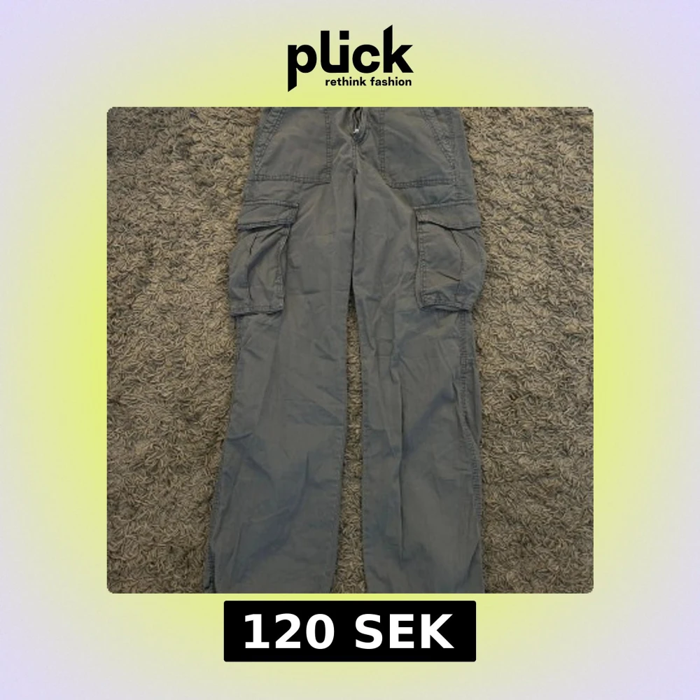 Säljer ett par grå cargobyxor med stora fickor på sidorna och baktill. Byxorna har en loose passform.