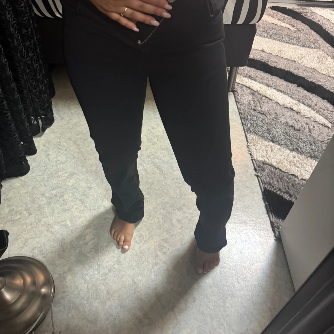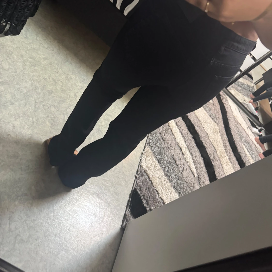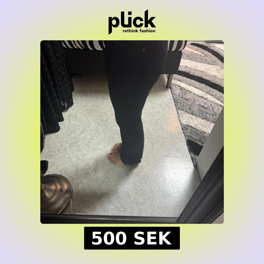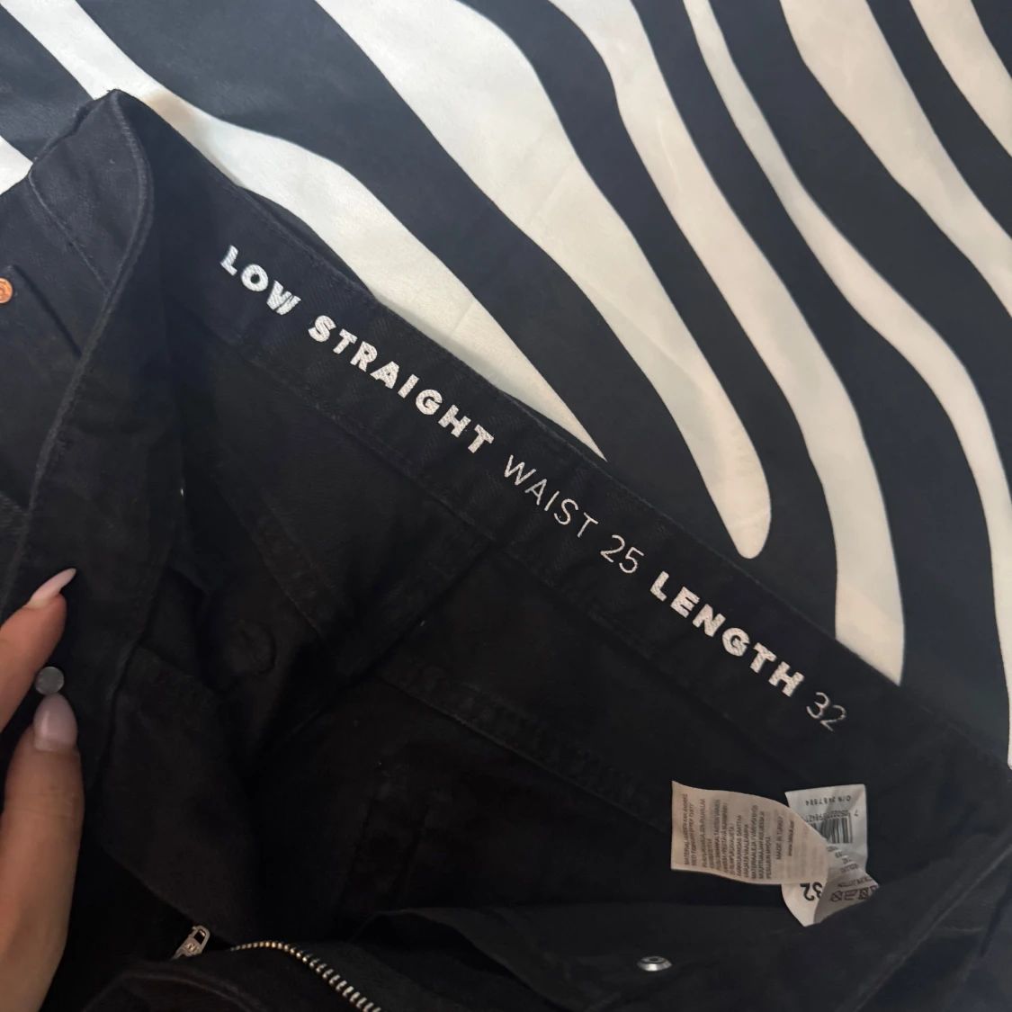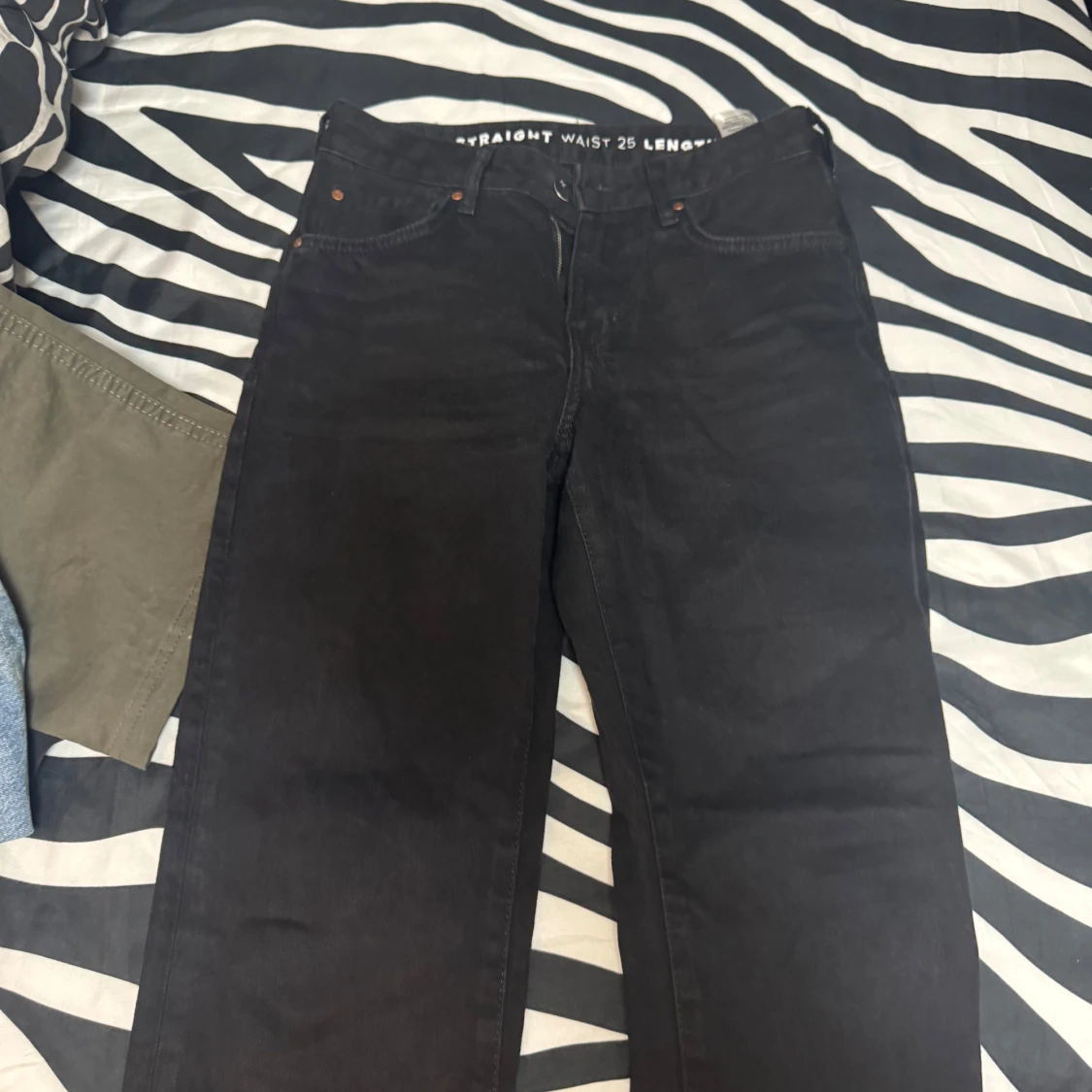 Säljer ett par svarta jeansbyxor med straight passform och hög midja. Klassisk femficksmodell med dragkedja och knapp framtill. Perfekta till en enkel t-shirt eller stickad tröja. Från bikbok