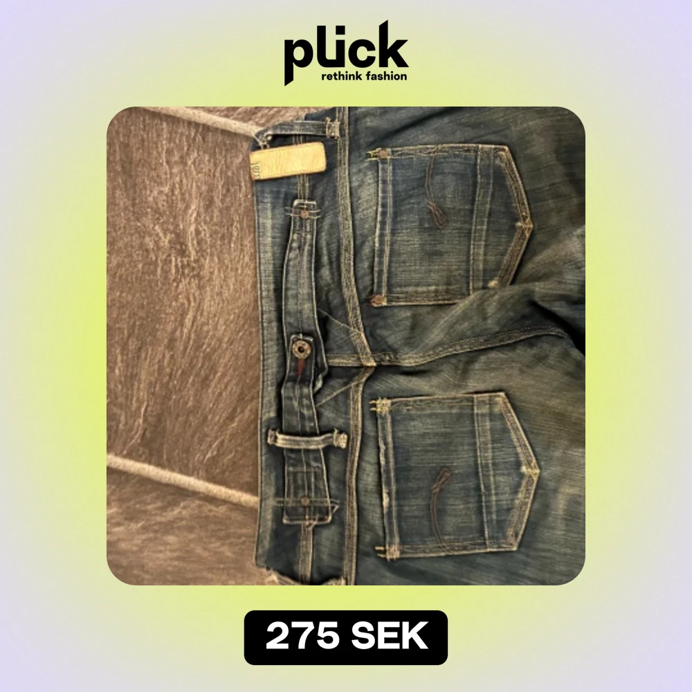 Hej, jag säljer nu dessa väldigt fina vintage jeans eftersom de har blivit försmå. De är i storlek 34 och har detaljer både där fram och där bak och ett hål på ena knät.