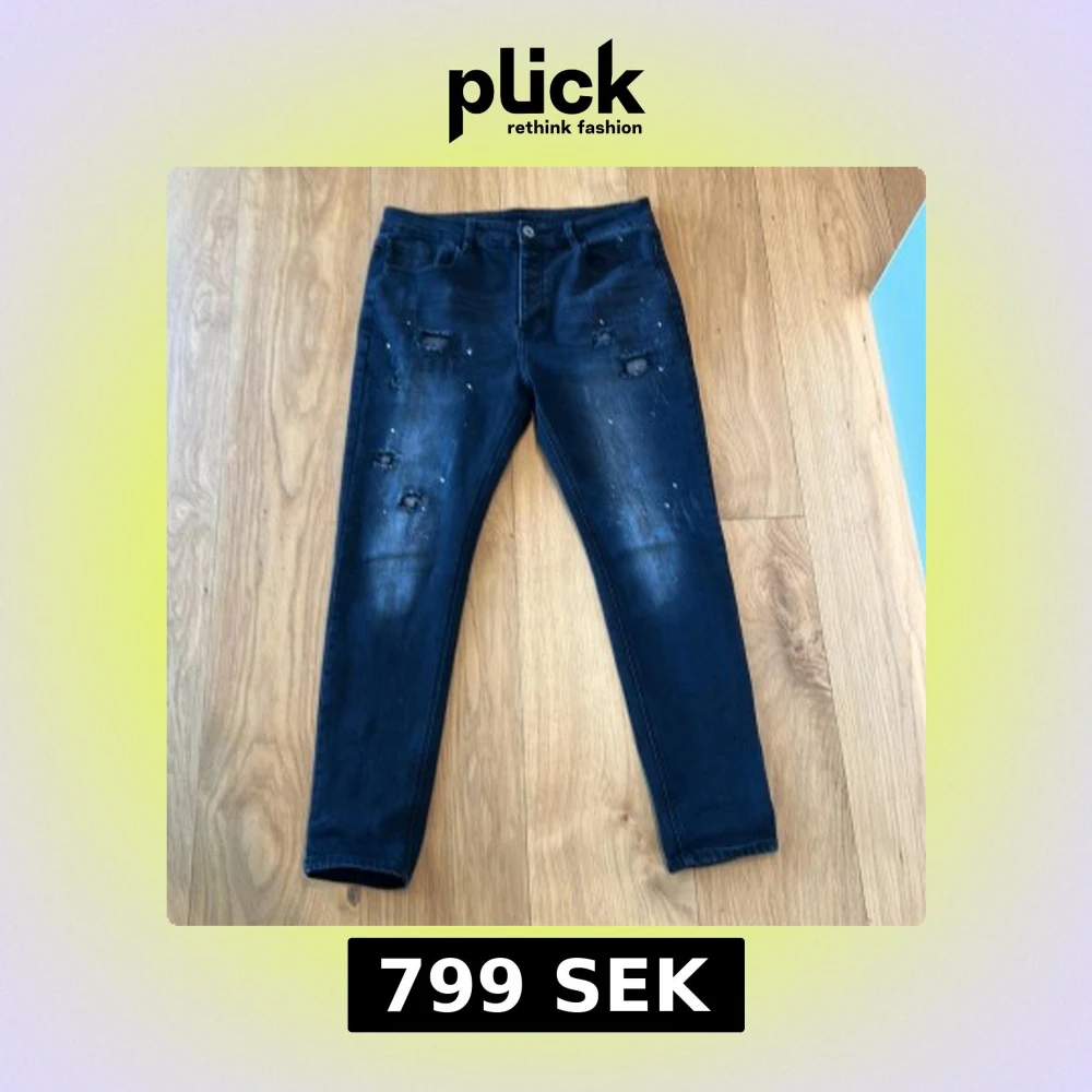 Snygga svarta jeans från KWD med slitna detaljer och lite färgstänk framtill. Dom är använda 3 gånger så helt nya, Jeansen har klassisk femficksdesign, normal midja och smal passform. Perfekta för dig som gillar en streetig och trendig look. Jag är 190 och dom är bra i längden men sitter lite tajt på mig då ja har rätt breda lår, hör av dig vid intresse