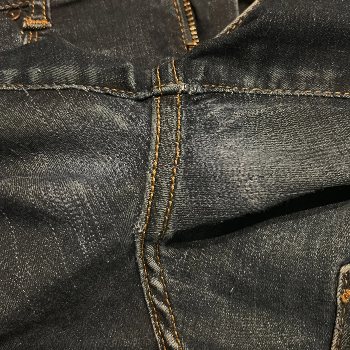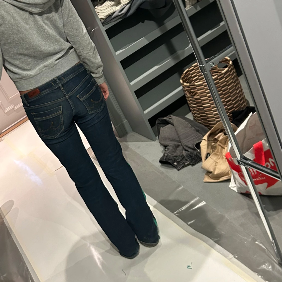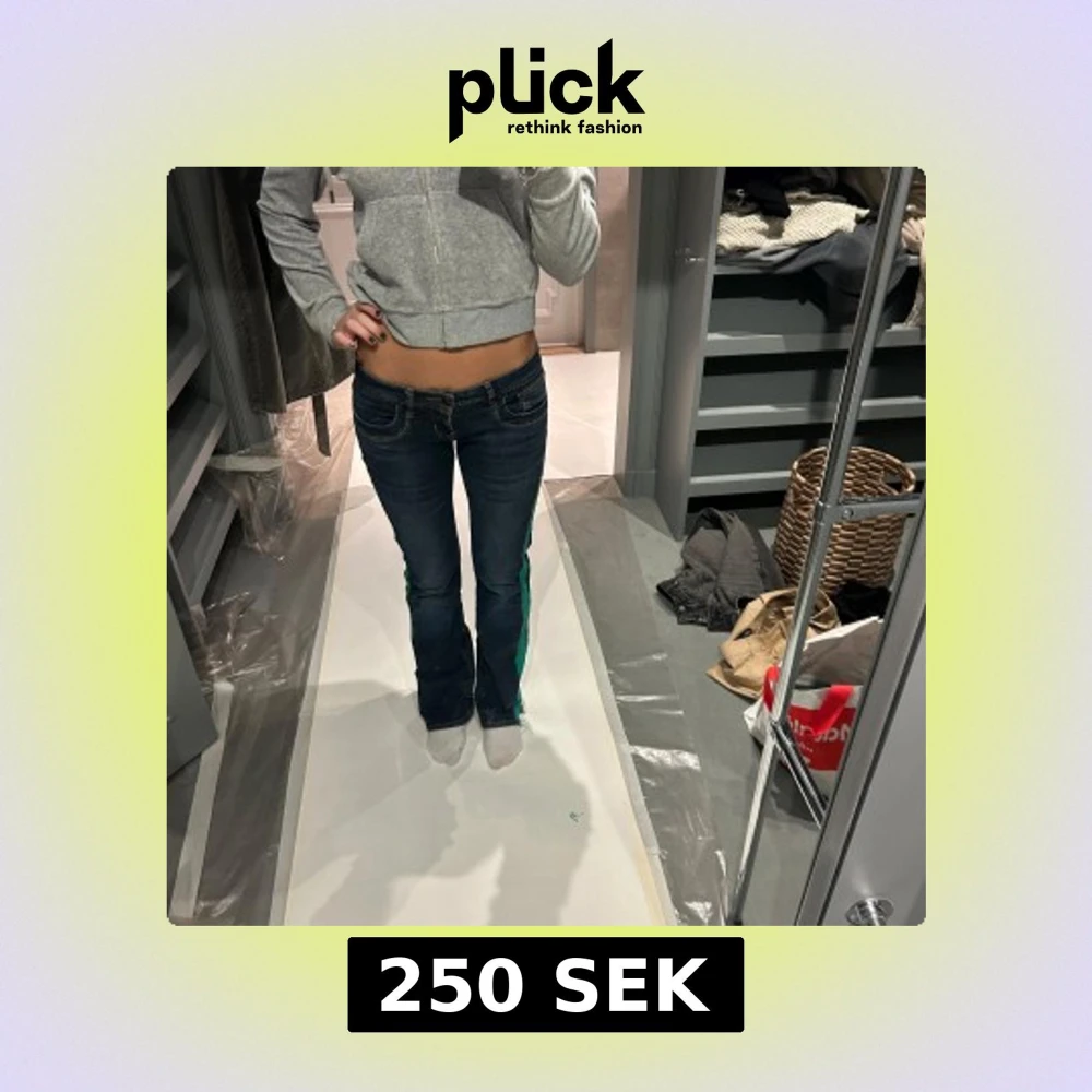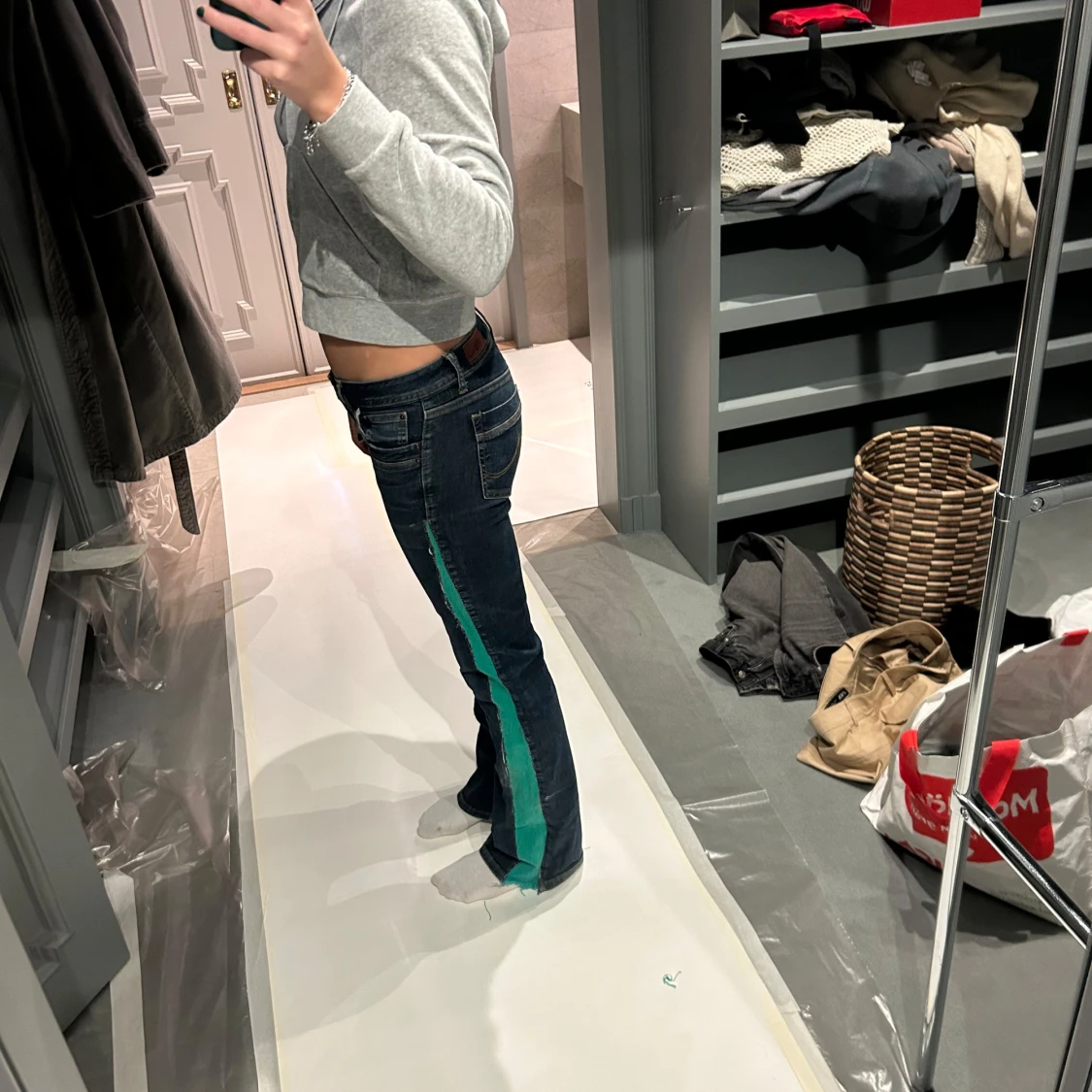 Snygga mörkblå jeans med en unik grön rand längs sidorna. De är lågmidjade och har en bootcut-stil som ger en retro känsla. Perfekta för att sticka ut med en cool och avslappnad look. Innebenslängd 88, midjemått 39