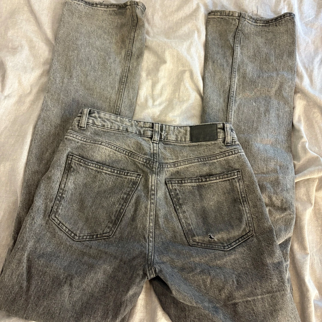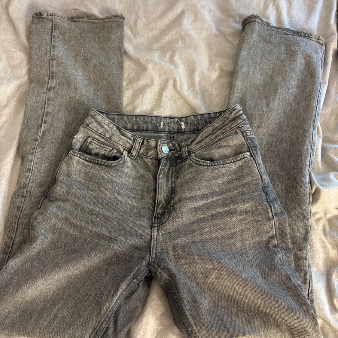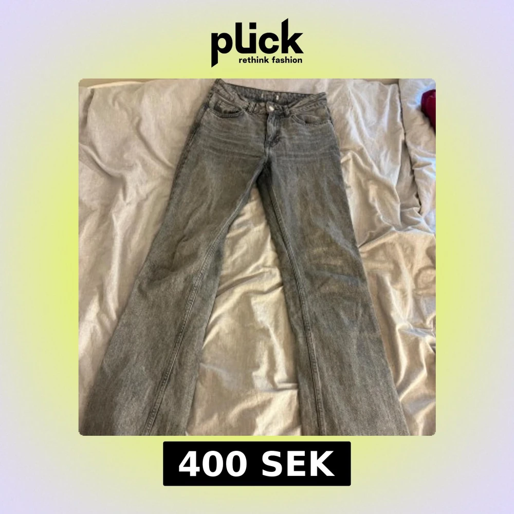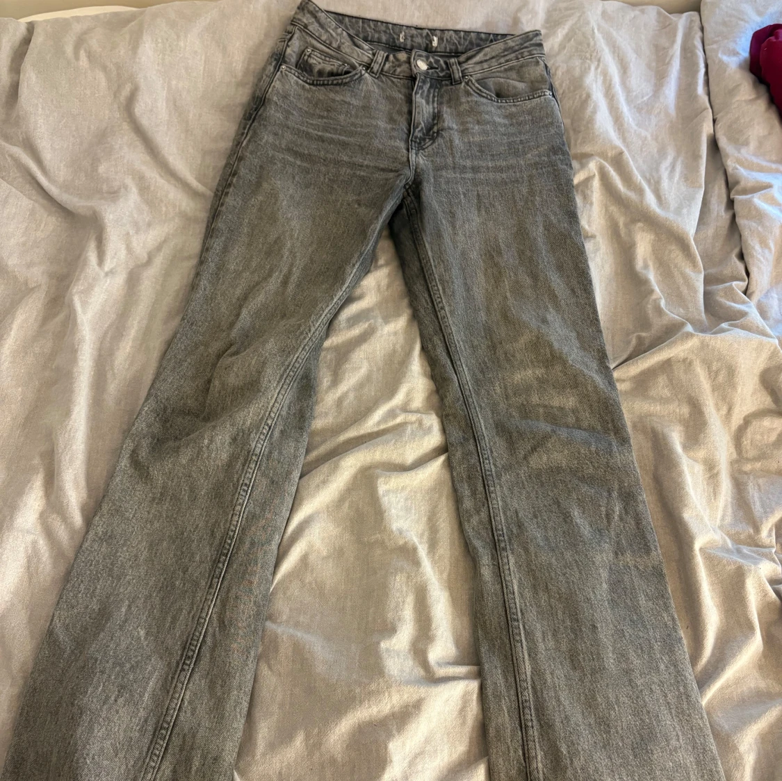 Säljer ett par grå bootcut jeans med klassisk femficksdesign. Jeansen har en snygg tvättad finish och normal midja. Perfekta för dig som gillar en avslappnad och tidlös stil. Materialet är robust denim som håller länge.