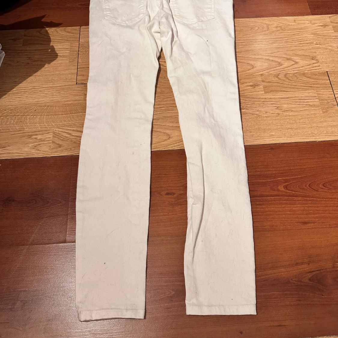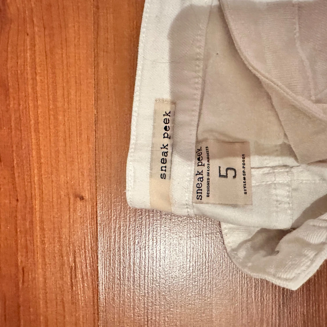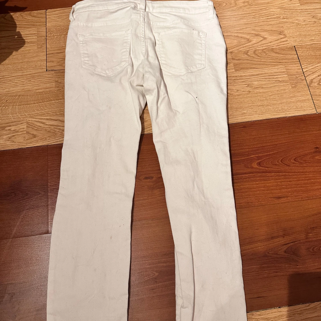 Säljer ett par vita jeans från Sneak Peek med flera slitningar framtill. Byxorna har fem fickor, normal passform och raka ben. Perfekta för en trendig och avslappnad look.